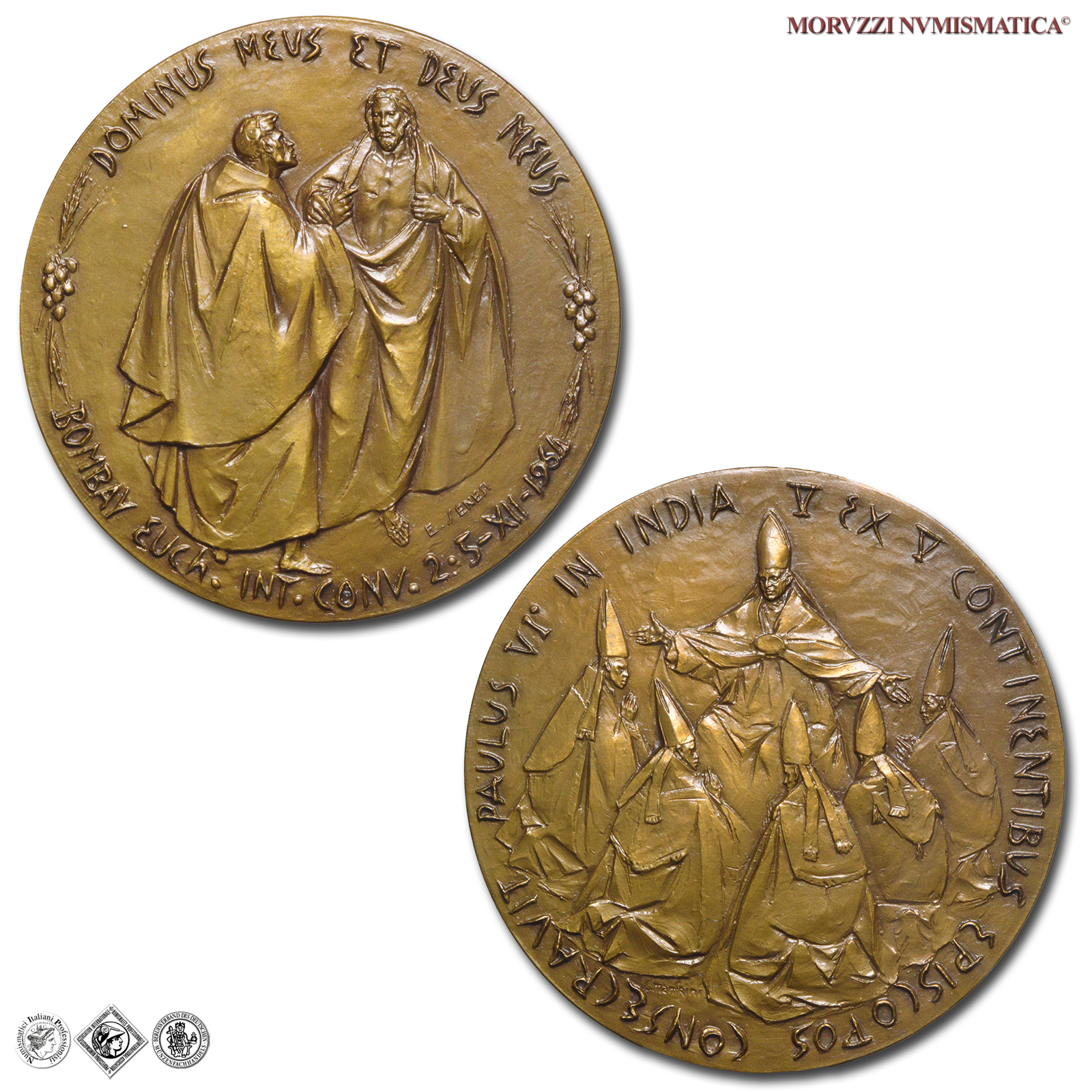 Città del Vaticano, PAOLO VI, Montini, 1963-1978, MEDAGLIA, Viaggio in India, Emissione: 1964, D/ PAULUS VI° IN INDIA V EX V CONTINENTIBUS EPISCOPOS CONSECRAVIT, Il Papa accoglie le preghiere dei nuovi vescovi; in basso a sinistra: E. MANFRINI, R/ DOMINUS MEUS ET DEUS MEUS (tra spighe e grappoli), Un martire mostra le sue ferite a Cristo; sotto: BOMBAY EUCH. INT. CONV. 2.5-XII-1964; in basso, a destra: E. SENESI, Opus Enrico Manfrini ed Emilio Senesi, Rif. bibl. Macri-Marinelli, 137; Metallo: AE, gr. 35,43, (MP154001), Diam.: mm. 44,35, FDC