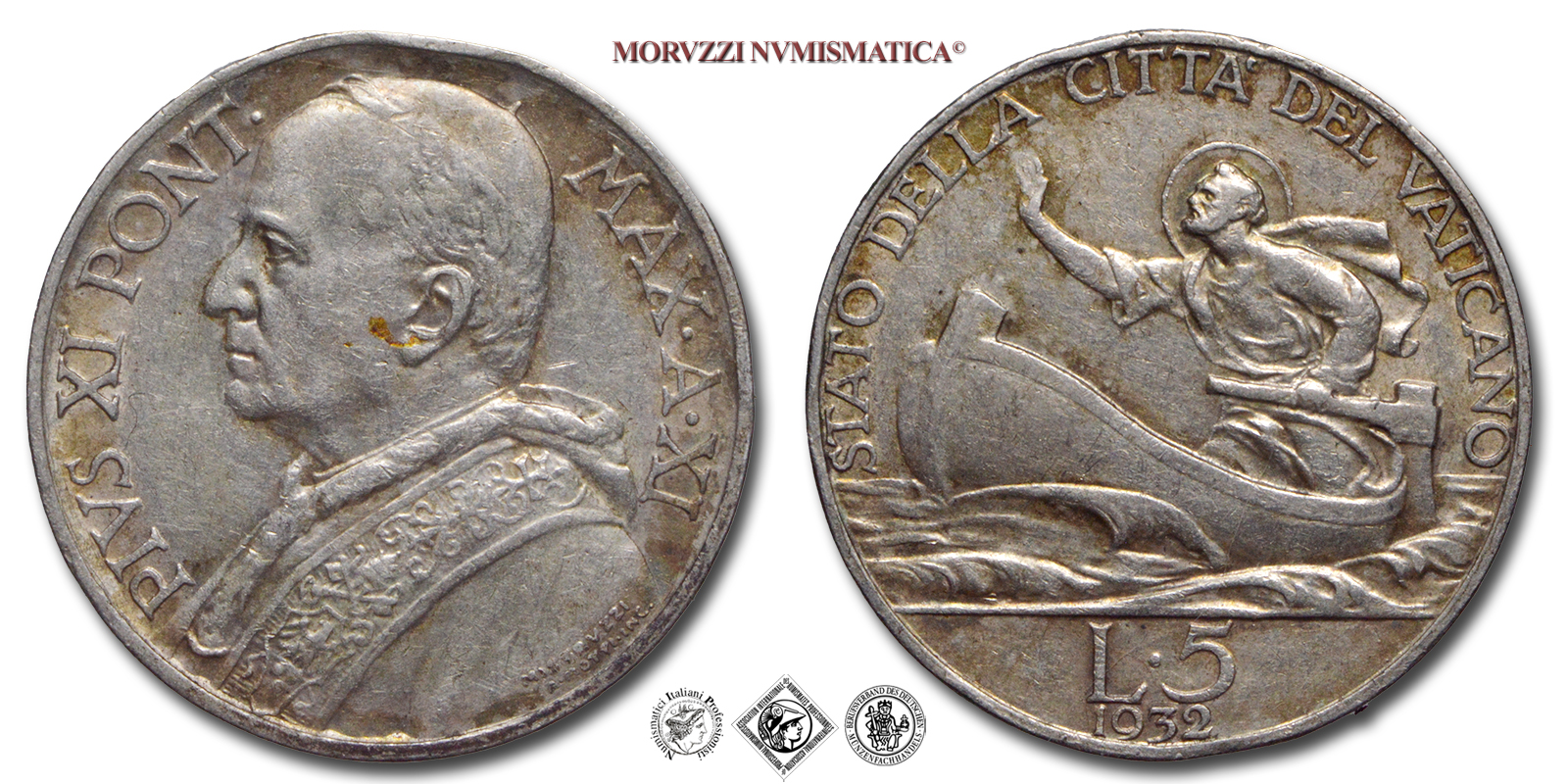 Città del Vaticano, PIO XI, Ratti, 1922-1939, LIRE 5, Emissione: 1932 A XI, D/ PIVS • XI • PONT • MAX • A • XI, busto del Pontefice con berretto, mozzetta e stola a s.; in basso, a d., su due righe: i nomi dell'autore (MISTRVZZI) e dell'incisore (A • MOTTI • INC •), R/ STATO DELLA CITTA' DEL VATICANO, San Pietro su una barca a s.; in esergo, su due righe: il valore (L•5) e il millesimo (1932), Zecca di Roma, Rif. bibl. Pagani, 635; Metallo: AR, gr. 4,99, (MX159624), Diam.: mm. 23,09, BB
