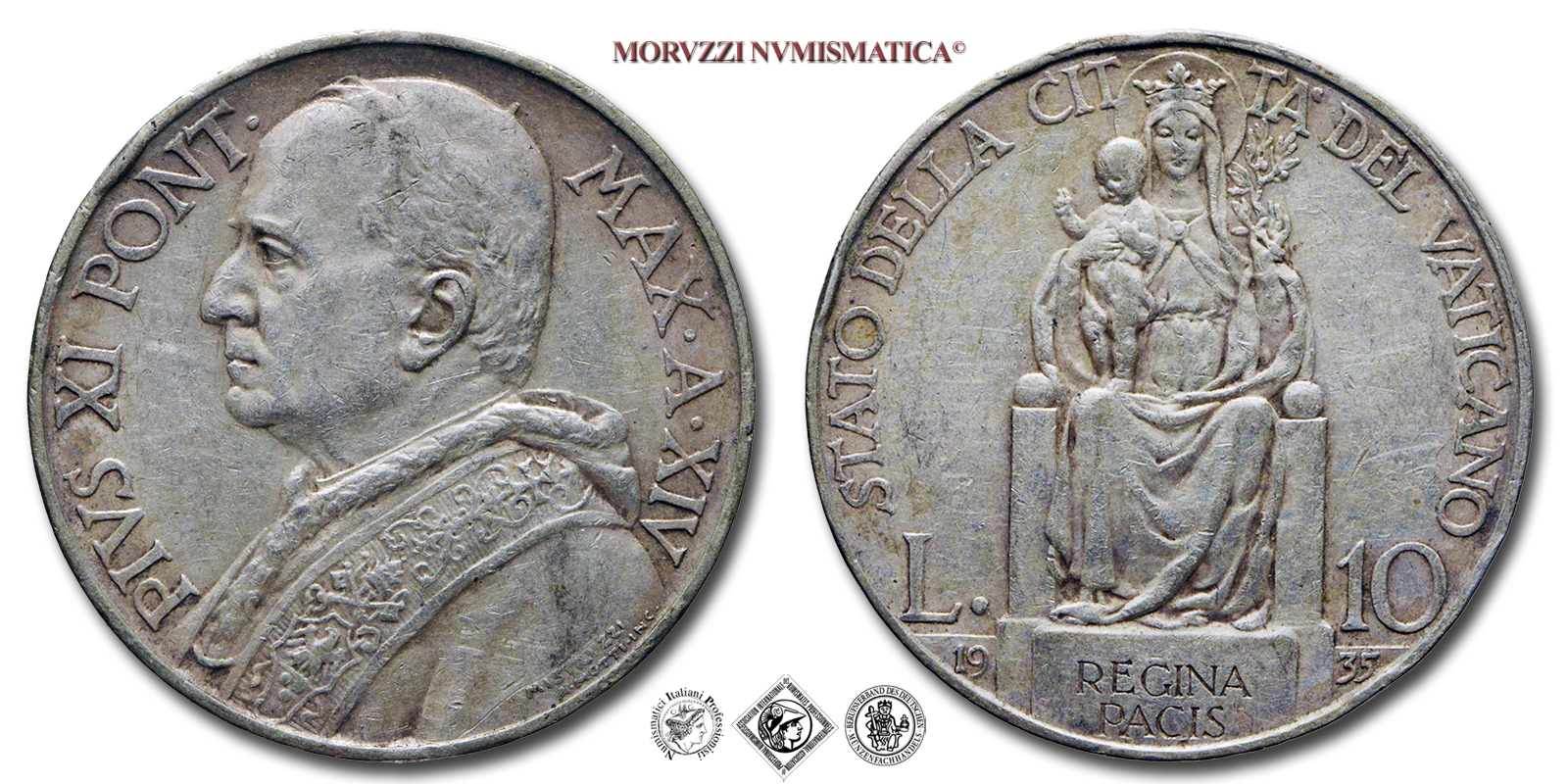 Città del Vaticano, PIO XI, Ratti, 1922-1939, 10 LIRE, Emissione: 1935 A XIV, D/ PIVS XI PONT • MAX • A • XIV, busto con berretto, mozzetto e stola a sinistra; in basso, a destra, su due righe: i nomi dell'autore (MISTRVZZI) e dell'incisore (A • MOTTI • INC •), R/ STATO DELLA CITTA' DEL VATICANO, immagine della maternità; In basso, ai lati, il nominale (L. 10) e il millesimo (19 35); in esergo, su due righe: REGINA PACIS, Zecca di Roma, Rif. bibl. Pagani, 628; Metallo: AR, gr. 10,01, (MX157392), Diam.: mm. 27,00, BB