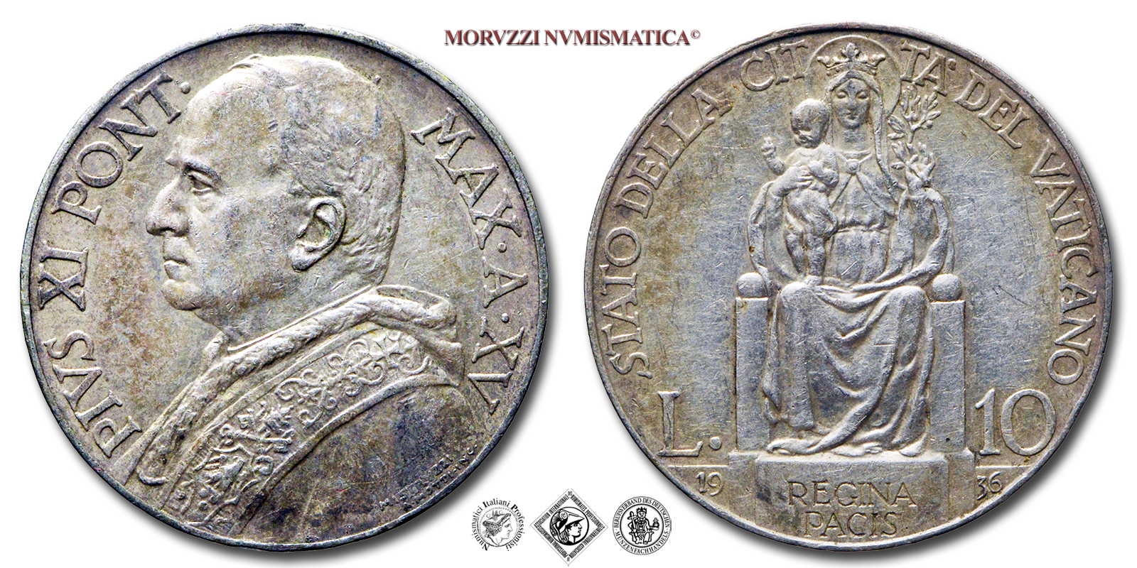 Città del Vaticano, PIO XI, Ratti, 1922-1939, 10 LIRE, Emissione: 1936 A XV, D/ PIVS XI PONT • MAX • A • XV, busto con berretto, mozzetto e stola a sinistra; in basso, a destra, su due righe: i nomi dell'autore (MISTRVZZI) e dell'incisore (A • MOTTI • INC •), R/ STATO DELLA CITTA' DEL VATICANO, immagine della maternità; In basso, ai lati, il nominale (L. 10) e il millesimo (1936); in esergo, su due righe: REGINA PACIS, Zecca di Roma, Rif. bibl. Pagani, 629; Metallo: AR, gr. 10,01, (MX157391), Diam.: mm. 27,02, SPL