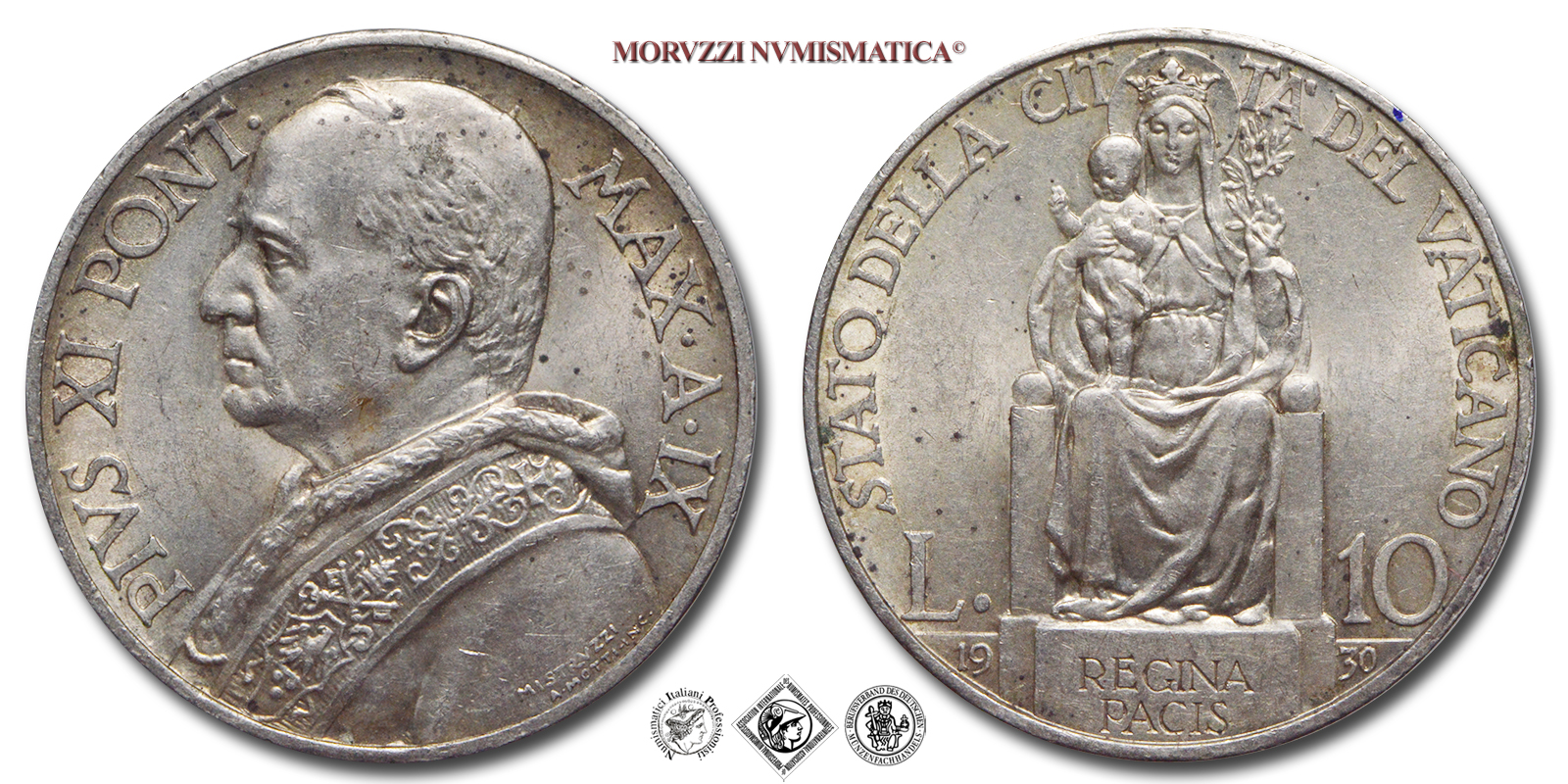 Città del Vaticano, PIO XI, Ratti, 1922-1939, LIRE 10, Emissione: 1930 A IX, D/ PIVS XI PONT • MAX • A • IX, busto con berretto, mozzetto e stola a sinistra; in basso, a destra, su due righe: i nomi dell'autore (MISTRVZZI) e dell'incisore (A • MOTTI • INC •), R/ STATO DELLA CITTA' DEL VATICANO, immagine della maternità; In basso, ai lati, il nominale (L. 10) e il millesimo (19 30); in esergo, su due righe: REGINA PACIS, Zecca di Roma, Rif. bibl. Pagani, 623; Metallo: AR, gr. 10,04, (MX159623), Diam.: mm. 27,04, mBB