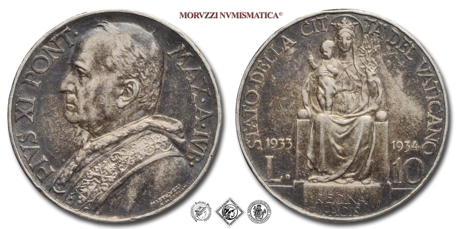 Città del Vaticano, PIO XI, Ratti, 1922-1939, LIRE 10, Emissione: 1933-1934, D/ PIVS XI PONT • MAX • A • IVB •, busto con berretto, mozzetto e stola a sinistra; in basso, a destra, su due righe: i nomi dell'autore (MISTRVZZI) e dell'incisore (A • MOTTI • INC •), R/ STATO DELLA CITTA' DEL VATICANO, immagine della maternità; In basso, ai lati, il nominale (L. 10) e il millesimo (1933-1934); in esergo, su due righe: REGINA PACIS, Zecca di Roma, Rif. bibl. Pagani, 626; Metallo: AR, gr. 10,03, (MX161954), Diam.: mm. 27,04, mBB