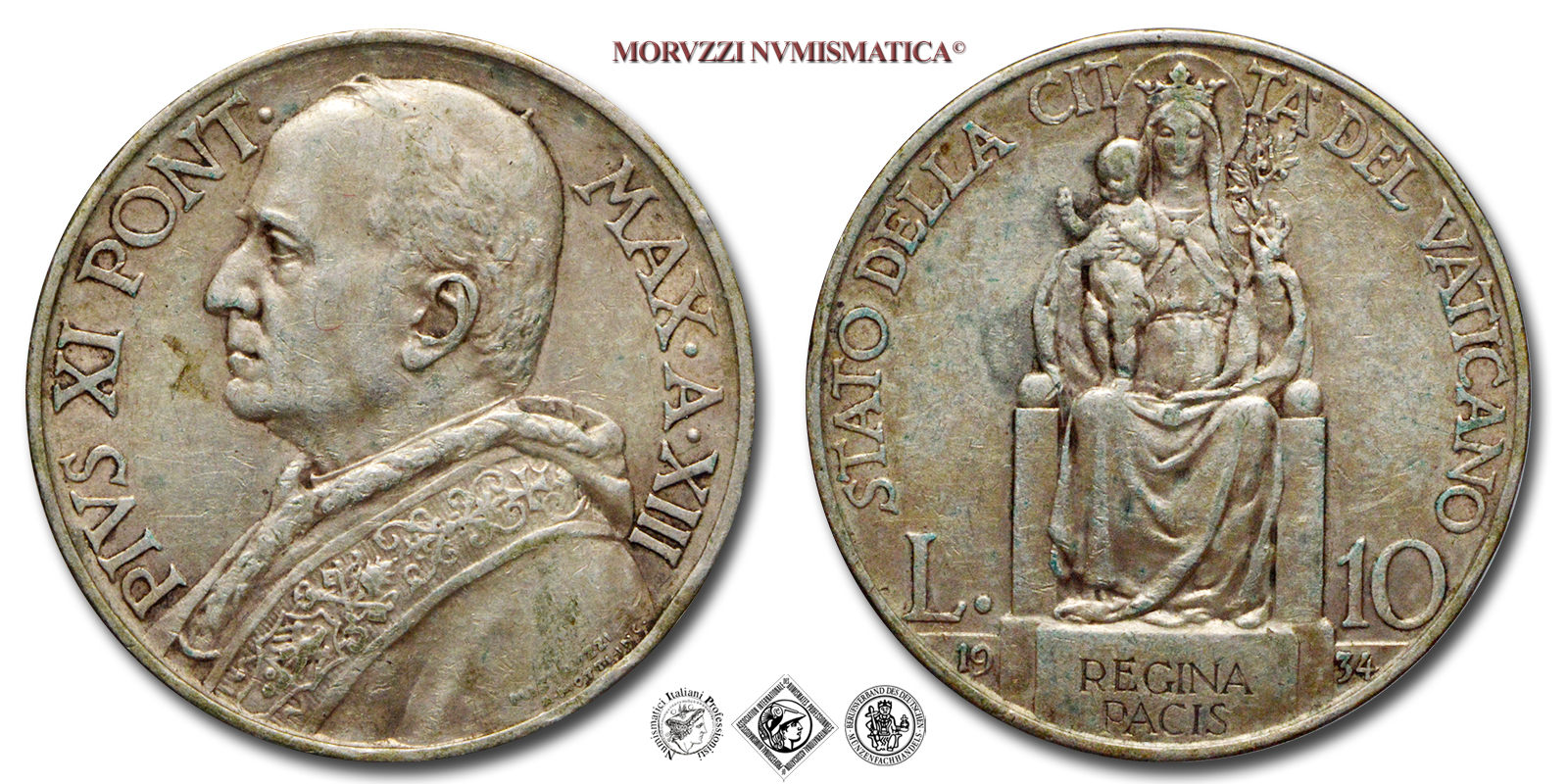 Città del Vaticano, PIO XI, Ratti, 1922-1939, LIRE 10, Emissione: 1934 A XIII, D/ PIVS XI PONT • MAX • A • XIII, busto con berretto, mozzetto e stola a sinistra; in basso, a destra, su due righe: i nomi dell'autore (MISTRVZZI) e dell'incisore (A • MOTTI • INC •), R/ STATO DELLA CITTA' DEL VATICANO, immagine della maternità; In basso, ai lati, il nominale (L. 10) e il millesimo (1934); in esergo, su due righe: REGINA PACIS, Zecca di Roma, Rif. bibl. Pagani, 627; Metallo: AR, gr. 9,90, (MX155607), Diam.: mm. 27,02, mBB