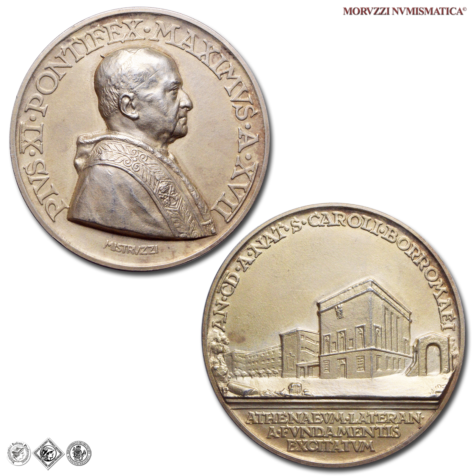 Città del Vaticano, PIO XI, Ratti, 1922-1939, MEDAGLIA, Il nuovo Ateneo Lateranense, Emissione: 1938 A XVII, D/ PIVS • XI • PONTIFEX • MAXIMVS • A • XVII, busto con berretto, mozzetta e stola a d.; sotto: MISTRVZZI, R/ AN • CD • A • NAT • S • CAROLI • BORROMAEI, prospetto del nuovo Ateneo; in esergo, su tre righe: ATHENAEVM • LATERAN • / A • FVNDAMENTIS / EXCITATVM, Opus Aurelio Mistruzzi, Rif. bibl. Bart., E938; Metallo: AR, gr. 39,65, (MP117076), Diam.: mm. 44,40, mSPL