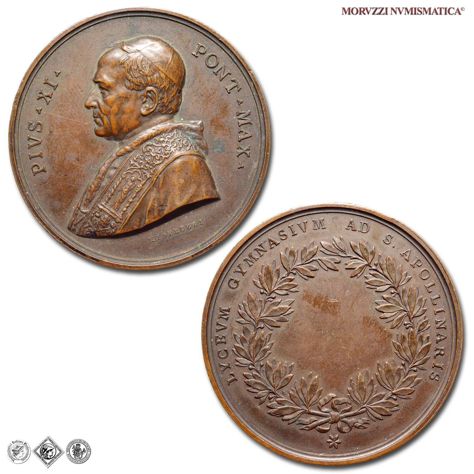 Città del Vaticano, PIO XI, Ratti, 1922-1939, MEDAGLIA PREMIO, Liceo-Ginnasio S. Apollinare di Roma, Emissione: Senza data, D/ PIVS • XI • _ PONT • MAX •, busto a s. con berretto, mozzetta e stola; sotto: MISTRVZZI, R/ LYCEVM GYMNASIVM AD S. APOLLINARIS, Campo vuoto tra rami d'alloro; sotto: *, Opus Aurelio Mistruzzi, Rif. bibl. Cus.-Mod., 337; Metallo: AE, gr. 32,06, (MP159185) ,Diam.: mm. 44,12, SPL