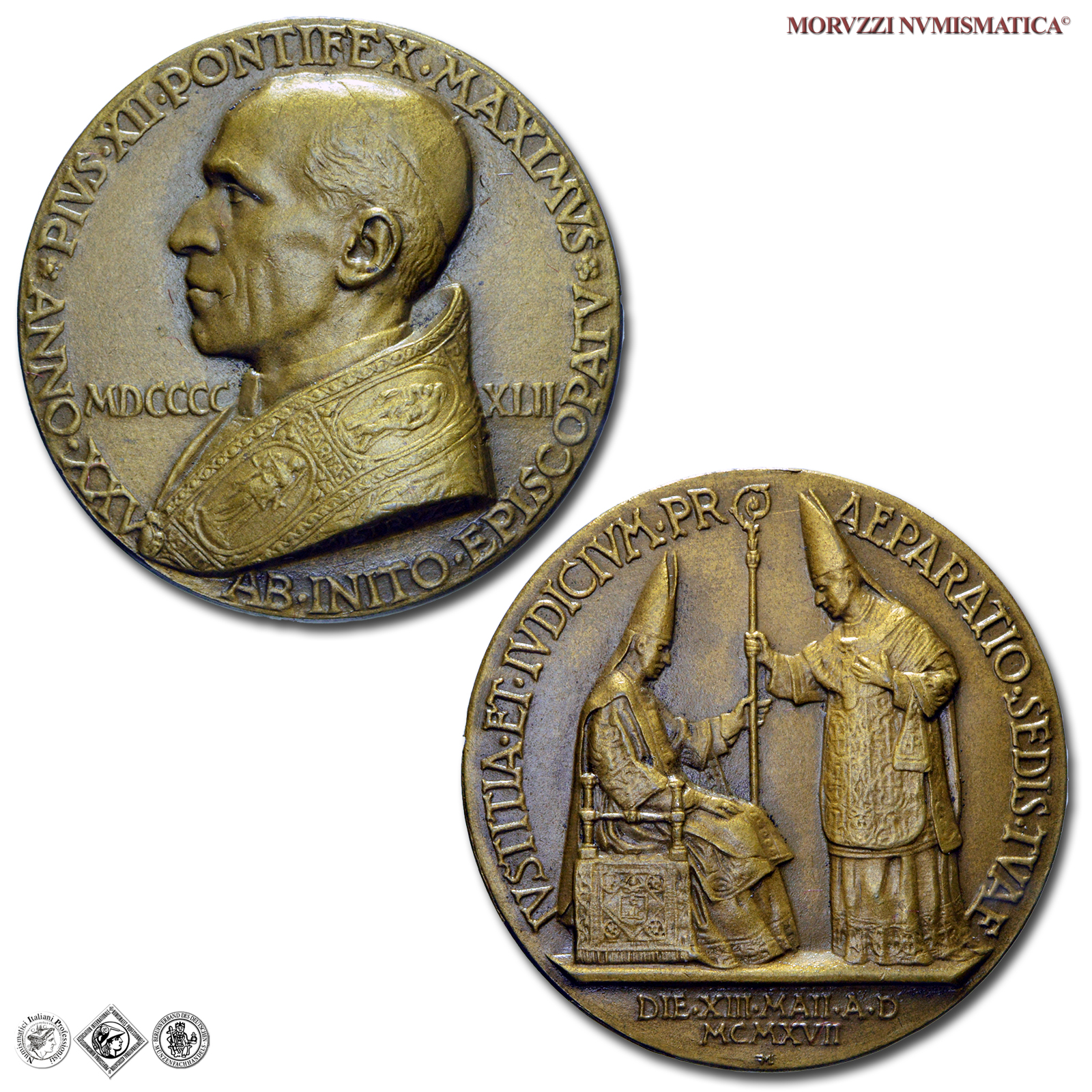 Nel maggio del 1942 ricorreva il 25° anniversario della consacrazione episcopale di Pio XII. La medaglia straordinaria coniata, emessa il 13/05/1942, con fondo opaco dallo Stabilimento F. M. Lorioli F.lli di Milano, opera del Mistruzzi, ricorda il Giubileo Episcopale del Papa.