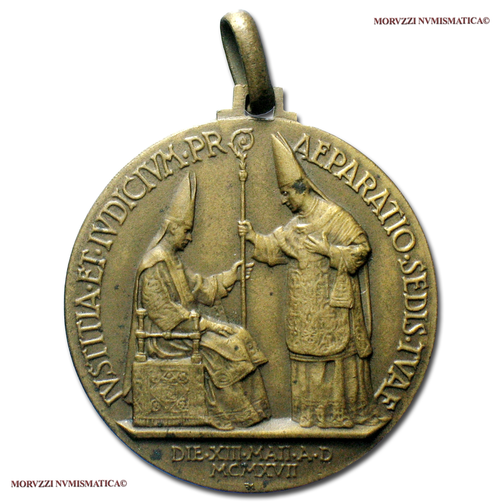 Città del Vaticano, PIO XII, Pacelli, 1939-1958, MEDAGLIA STRAORDINARIA IN BRONZO, 25° anniversario della consacrazione episcopale, Emissione: 1942, D/ * PIVS • XII • PONTIFEX • MAXIMVS * / ANNO • XXV AB • INITO • EPISCOPATV, busto con zucchetto e piviale a s.; nel campo: MDCCCCXLII, R/ IVSTITIA • ET • IVDICIVM • PRAEPARATIO • SEDIS • TVAE, Benedetto XV consacra Eugenio Pacelli seduto a s. in trono con mitra; in esergo: DIE • XIII • MAII • A • D / MCMXVII; sotto: FML (LORIOLI - MILANO - ROMA), Opus Aurelio Mistruzzi, Rif. bibl. Cus.-Mod., 31; gr. 12,71, (MP130869), Diam.: mm. 30,95, qFDC, (R)