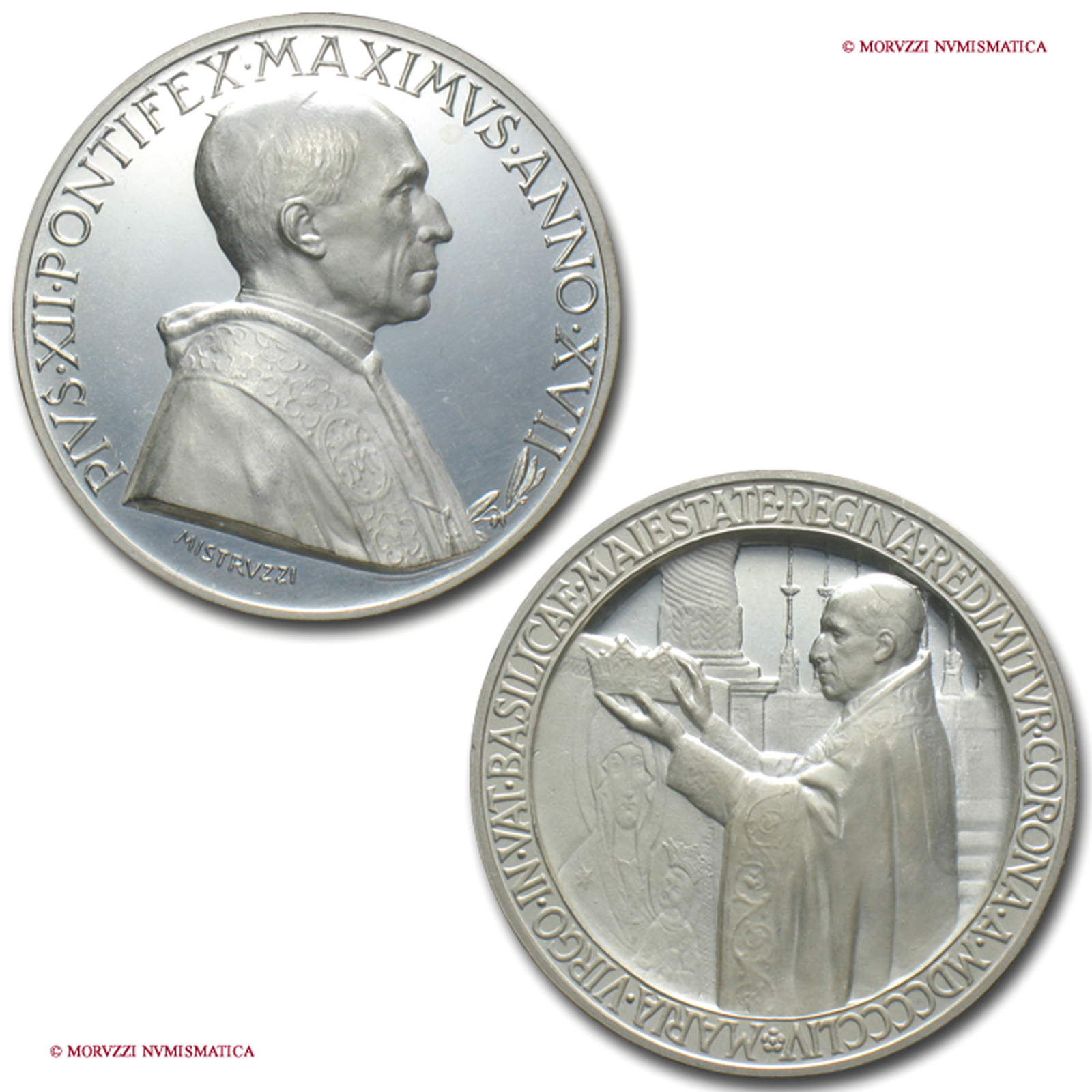 Chiusura dell'Anno Mariano, Emissione: (1955) A. XVII, Opus Aurelio Mistruzzi, Rif. bibl. Bart. 955; Metallo: AR, gr. 35,80, (MP55339), Diam.: mm. 44,00, FDC