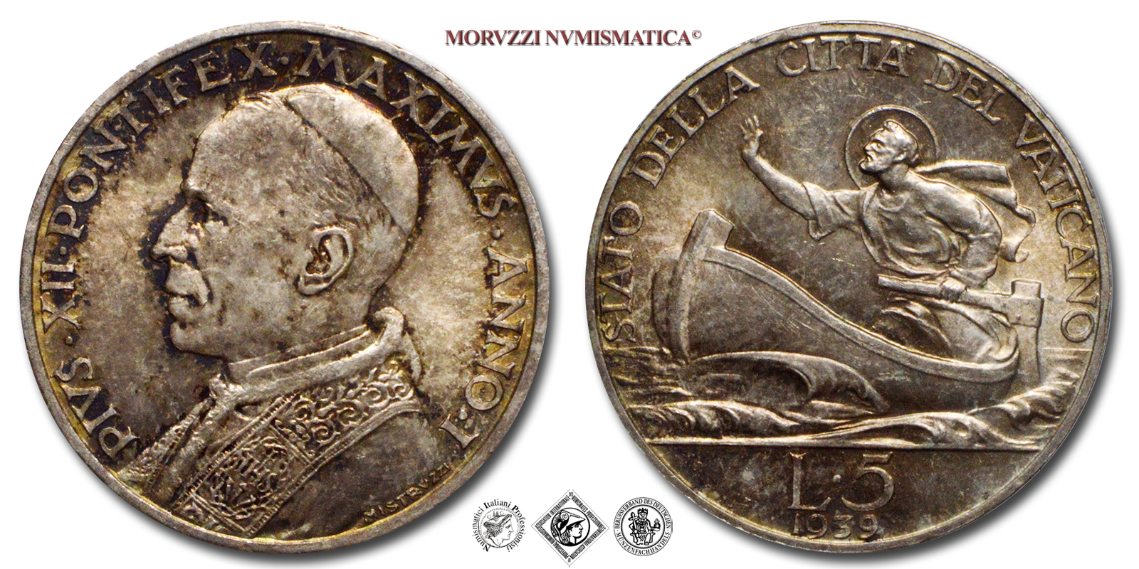 Città del Vaticano, PIO XII, Pacelli, 1939-1958, LIRE 5, Emissione: 1939 ANNO I, D/ PIVS • XII • PONTIFEX • MAXIMVS • ANNO • I, busto del Pontefice a s.; in basso, a d.: MISTRVZZI, R/ STATO DELLA CITTA' DEL VATICANO, San Pietro su una barca; in esergo, su due righe: indicazione del nominale (L•5) e del millesimo (1939), Zecca di Roma, Rif. bibl. Pagani, 754; Metallo: AR, gr. 5,01, (MX159839), Diam.: mm. 23,14, FDC
