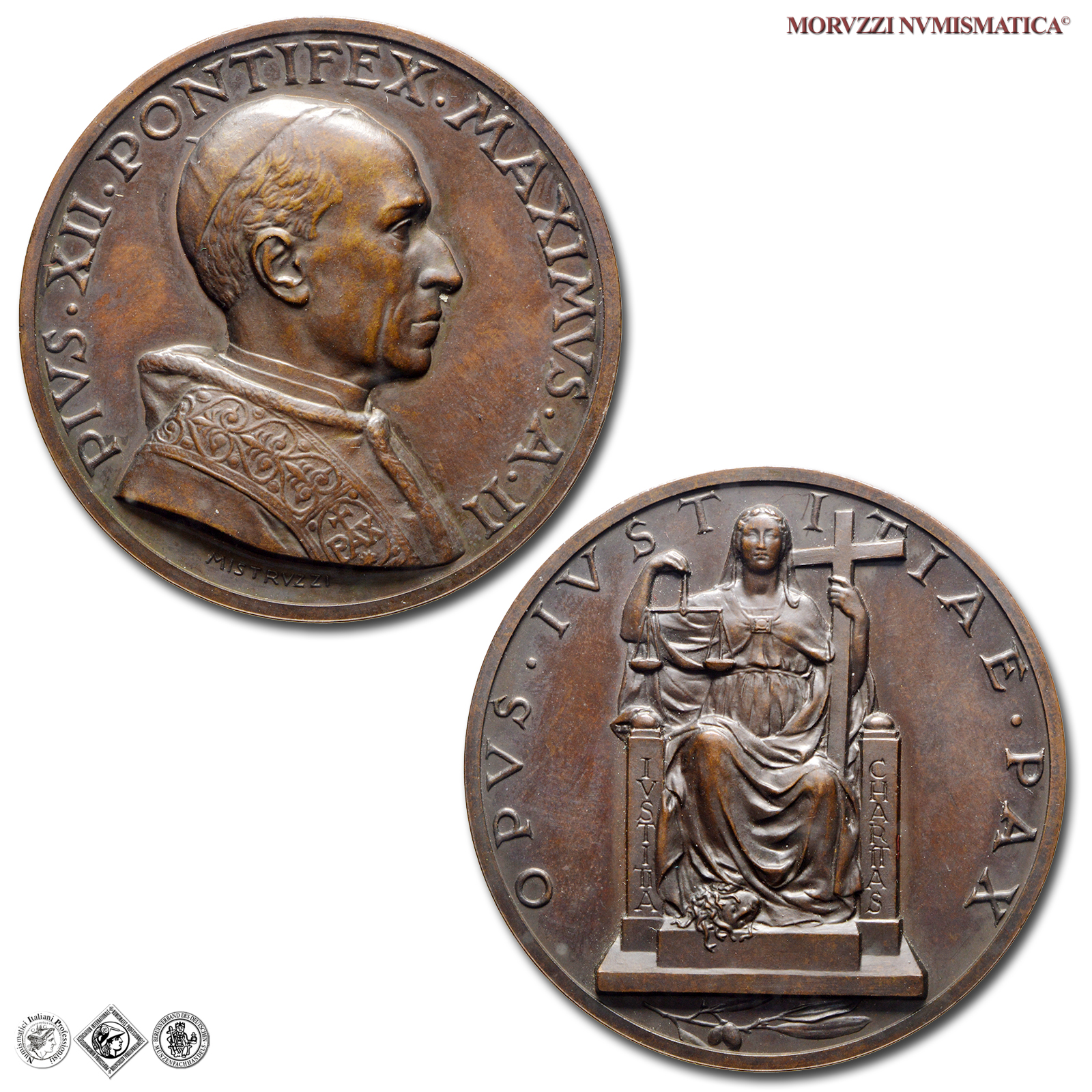 Città del Vaticano, PIO XII, Pacelli, 1939-1958, MEDAGLIA, Esortazione alla Pace, Emissione: 1940 A II, D/ PIVS • XII • PONTIFEX • MAXIMVS • A • II, busto con berretto, mozzetta e stola a d.; sotto: MISTRVZZI, R/ OPVS • IVSTITIAE • PAX, la Pace in trono trionfa sullo spirito del male, rappresentato dalla testa mozzata della Medusa e reca la Croce, simbolo della Carità e la bilancia, simbolo della Giustizia; in esergo: ramo d'ulivo, Opus Aurelio Mistruzzi, Rif. bibl. Bart., E940; Metallo: AE, gr. 36,22, (MP140952), Diam.: mm. 44,00, FDC, (R)