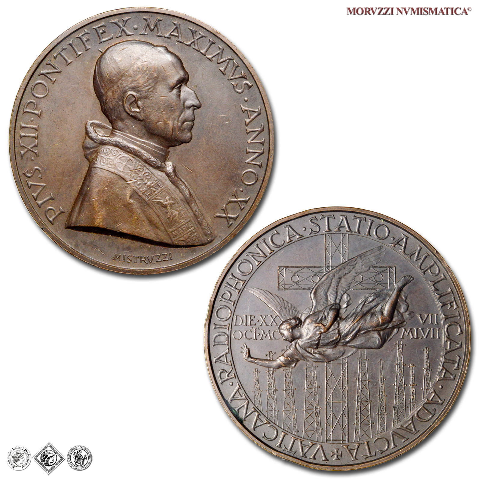 Città del Vaticano, PIO XII, Pacelli, 1939-1958, MEDAGLIA, Ampliamento della stazione Radio Vaticana, Emissione: 1958 ANNO XX, D/ PIVS • XII • PONTIFEX • MAXIMVS • ANNO • XX, busto del Pontefice con berretto, mozzetta e stola a d.; Sotto: MISTRVZZI, R/ VATICANA • RADIOPHONICA • STATIO • AMPLIFICATA • ADAVCTA ✠, l'arcangelo Gabriele in volo a s. sullo sfondo di antenne della radio; ai lati: DIE•XX / OCT•MC (a s.) e VII / MLVII (a d.), Opus Aurelio Mistruzzi, Rif. bibl. Bart., E958; Metallo: AE, gr. 35,12, (MP140974), Diam.: mm. 43,14, qFDC
