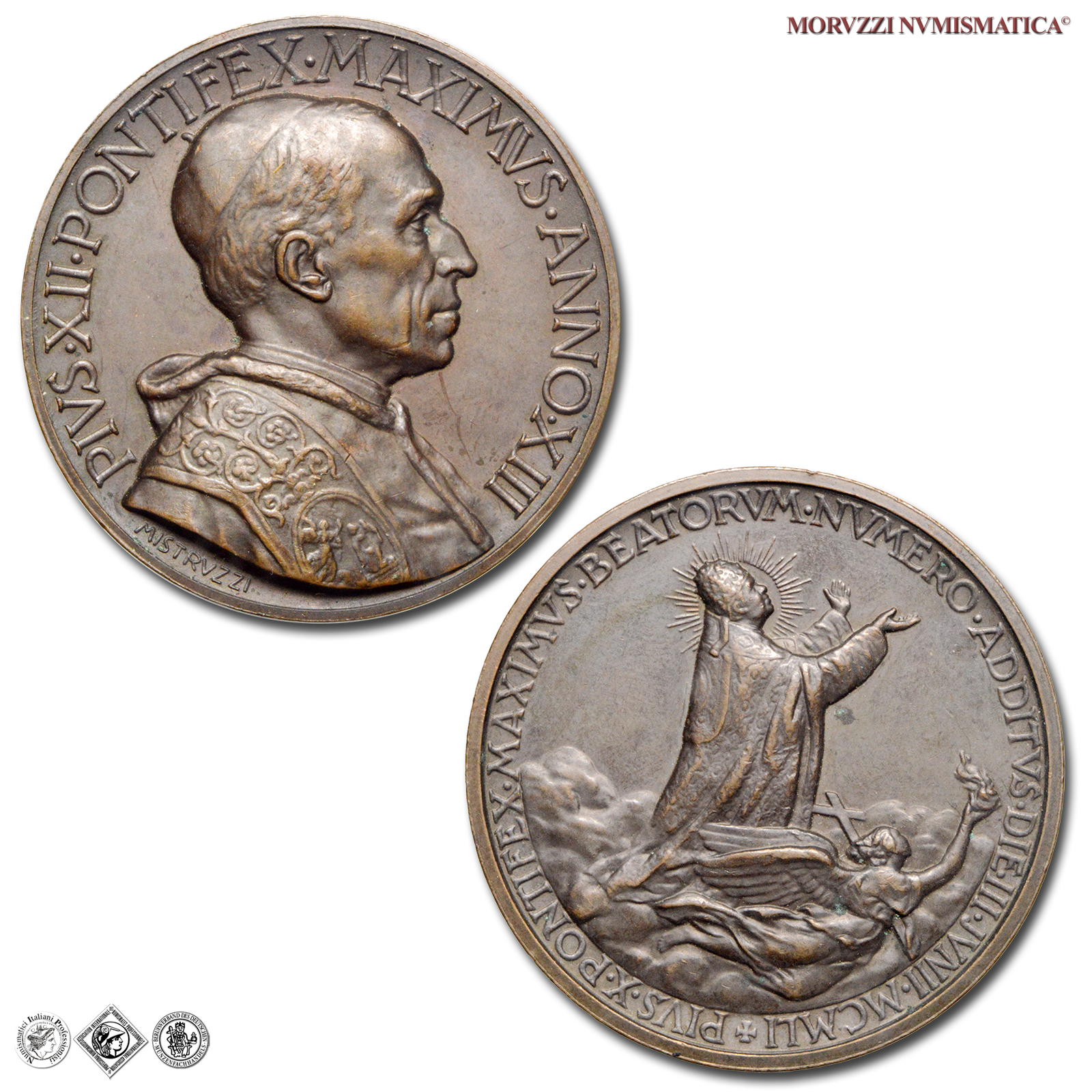 Città del Vaticano, PIO XII, Pacelli, 1939-1958, MEDAGLIA, Beatificazione di Pio X, Emissione: 1951 ANNO XIII, D/ PIVS • XII • PONTIFEX • MAXIMVS • ANNO • XIII, busto del Pontefice a d. con berretto, mozzetta e stola; sotto: MISTRVZZI, R/ PIVS • X • PONTIFEX • MAXIMVS • BEATORVM • NVMERO • ADDITVS • DIE • III • JVNII • MCMLI +, Pio X genuflesso in preghiera verso d., a capo raggiante, accompagnato dall'Angelo della Fede con la Croce appoggiata sulla spalla s. ed una lucerna accesa nella d., Opus Aurelio Mistruzzi, Rif. bibl. Bart., E951; Metallo: AE, gr. 33,22, (MP140978), Diam.: mm. 44,01, FDC