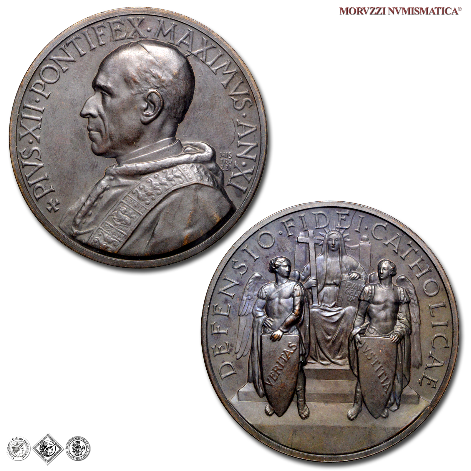 Città del Vaticano, PIO XII, Pacelli, 1939-1958, MEDAGLIA, Difesa della fede cattolica, Emissione: 1949 AN XI, D/ ✠ PIVS • XII • PONTIFEX • MAXIMVS • AN • XI, busto con berretto, mozzetta e stola a s.; dietro alla spalla: MIS / TRV / ZZI, R/ DEFENSIO • FIDEI • CATHOLICAE, la Fede radiata in trono, con la croce ed il Vangelo. A sua difesa due angeli con lo scudo su cui è scritto VERITAS e IVSTITIA, Opus Aurelio Mistruzzi, Rif. bibl. Bart., E949; Metallo: AE, gr. 34,64, (MP140943), Diam.: mm. 43,96, FDC