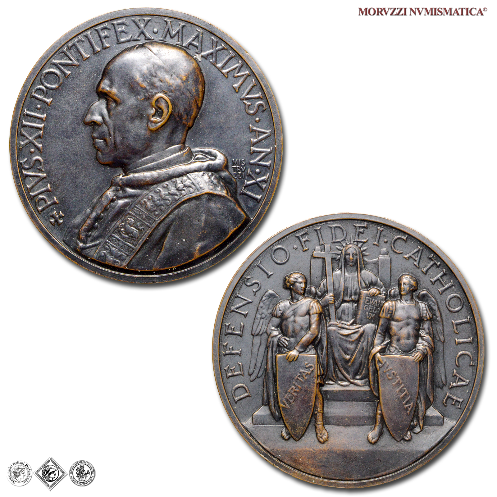 Città del Vaticano, PIO XII, Pacelli, 1939-1958, MEDAGLIA, Difesa della fede cattolica, Emissione: 1949 AN XI, D/ ✠ PIVS • XII • PONTIFEX • MAXIMVS • AN • XI, busto con berretto, mozzetta e stola a s.; dietro alla spalla: MIS / TRV / ZZI, R/ DEFENSIO • FIDEI • CATHOLICAE, la Fede radiata in trono, con la croce ed il Vangelo. A sua difesa due angeli con lo scudo su cui è scritto VERITAS e IVSTITIA, Opus Aurelio Mistruzzi, Rif. bibl. Bart., E949; Metallo: AE, gr. 33,48, (MP140954), Diam.: mm. 43,95, FDC