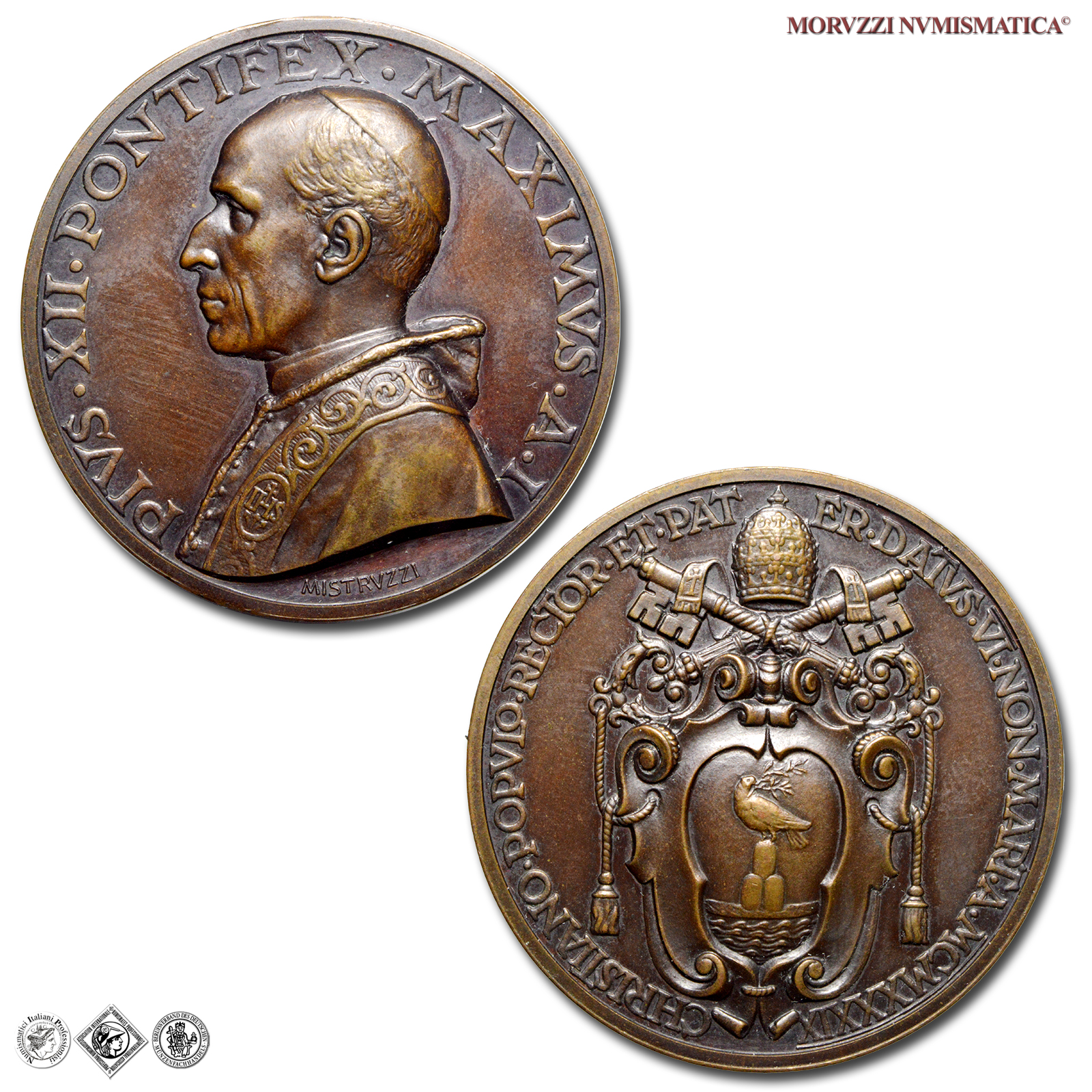 Medaglia annuale emessa il 29-06-1939, con fondo lucido, dalla Regia Zecca Italiana, a ricordo dell'elezione al pontificato e per l'Incoronazione del Papa avvenuta il 06-03-1939.