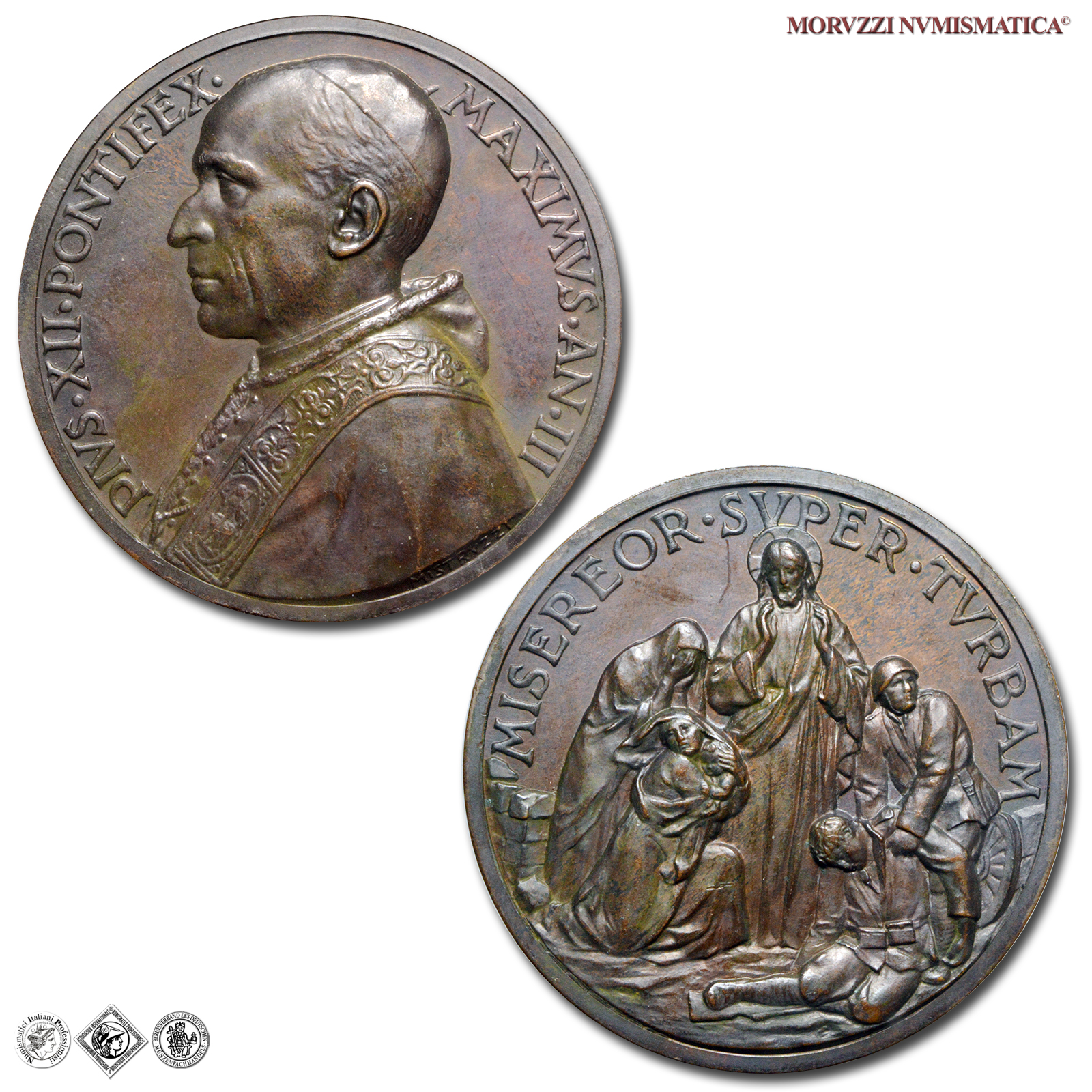 Città del Vaticano, PIO XII, Pacelli, 1939-1958, MEDAGLIA, Gesú Misericordioso (Invocazione di pace), Emissione: 1941 AN III, D/ PIVS • XII • PONTIFEX • MAXIMVS • AN • III, busto a s. con berretto, mozzetta e stola, R/ MISEREOR • SVPER • TVRBAM, Gesú nimbato in piedi tra due madri ed un soldato che sorregge un compagno ferito, Opus Aurelio Mistruzzi, Rif. bibl. Bart., E941; Metallo: AE, gr. 37,36, (MP159934), Diam.: mm. 43,97, FDC, (R)