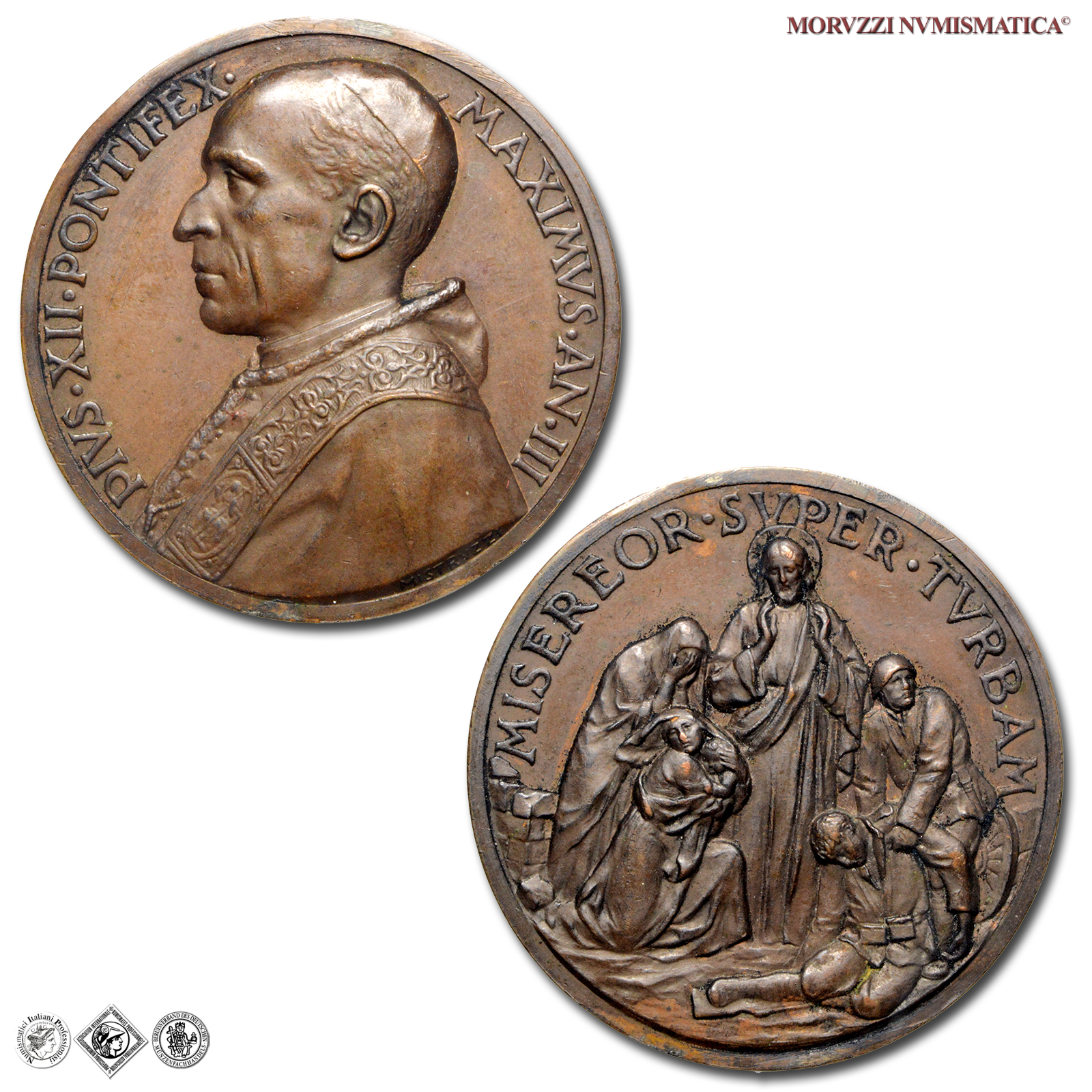 Città del Vaticano, PIO XII, Pacelli, 1939-1958, MEDAGLIA, Gesú Misericordioso (Invocazione di pace), Emissione: 1941 AN III, D/ PIVS • XII • PONTIFEX • MAXIMVS • AN • III, busto a s. con berretto, mozzetta e stola, R/ MISEREOR • SVPER • TVRBAM, Gesú nimbato in piedi tra due madri ed un soldato che sorregge un compagno ferito, Opus Aurelio Mistruzzi, Rif. bibl. Bart., E941; Metallo: AE, gr. 35,07, (MP140962), Diam.: mm. 43,95, SPL, (R)