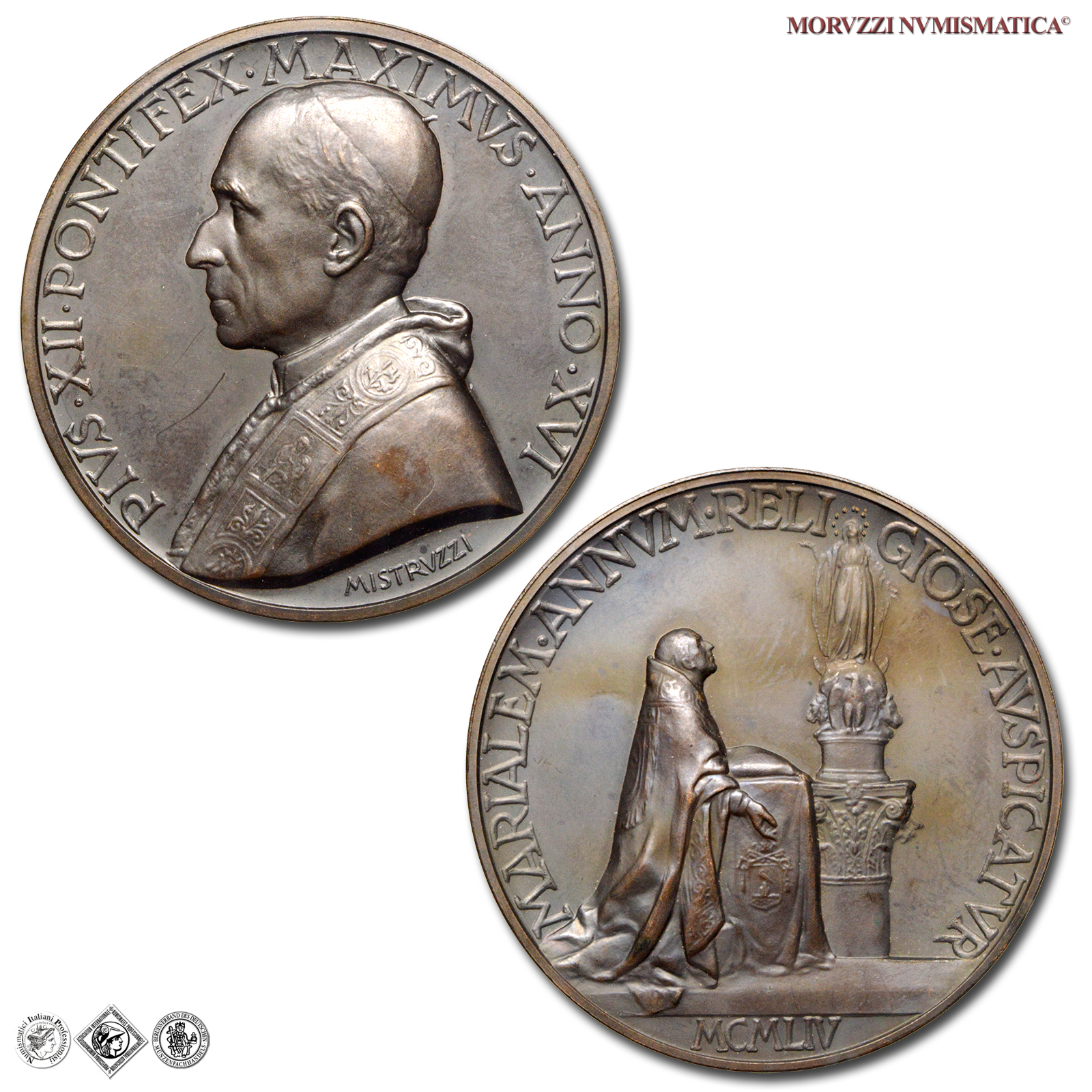 Città del Vaticano, PIO XII, Pacelli, 1939-1958, MEDAGLIA, Proclamazione dell'Anno Mariano, Emissione: 1954 A XVI, D/ PIVS • XII • PONTIFEX • MAXIMVS • ANNO • XVI, Busto del Pontefice con berretto, mozzetta e stola a s.; in basso: MISTRVZZI, R/ MARIALEM • ANNVM • RELIGIONE • AVSPICATVR, Il Papa stante, davanti alla colonna dell'Immacolata Concezione in Piazza di Spagna; in esergo: MCMLIV, Opus Aurelio Mistruzzi, Rif. bibl. Bart., E954; Metallo: AE, gr. 32,75, (MP140971), Diam.: mm. 43,97, FDC