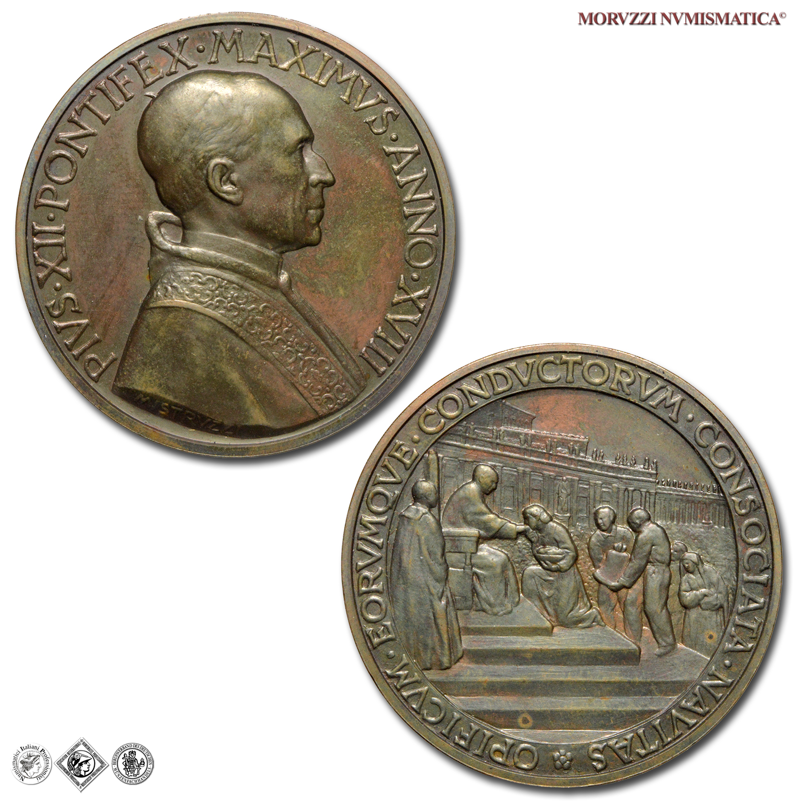 Città del Vaticano, PIO XII, Pacelli, 1939-1958, MEDAGLIA, Proclamazione della festa del lavoro cristiano, Emissione: 1956 ANNO XVIII, D/ PIVS • XII • PONTIFEX • MAXIMVS • ANNO • XVIII, busto con berretto, mozzetta e stola a d.; sul taglio spalla: MISTRVZZI, R/ OPIFICVM • OERVMQVE • CONDVCTORVM • CONSOCIATA • NAVITAS, Il Papa in trono sul sagrato della Basilica Vaticana, riceve l'omaggio dei rappresentanti dei lavoratori Cattolici, Opus Aurelio Mistruzzi, Rif. bibl. Bart., E956; Metallo: AE, gr. 37,62, (MP140947), Diam.: mm. 44,00, FDC