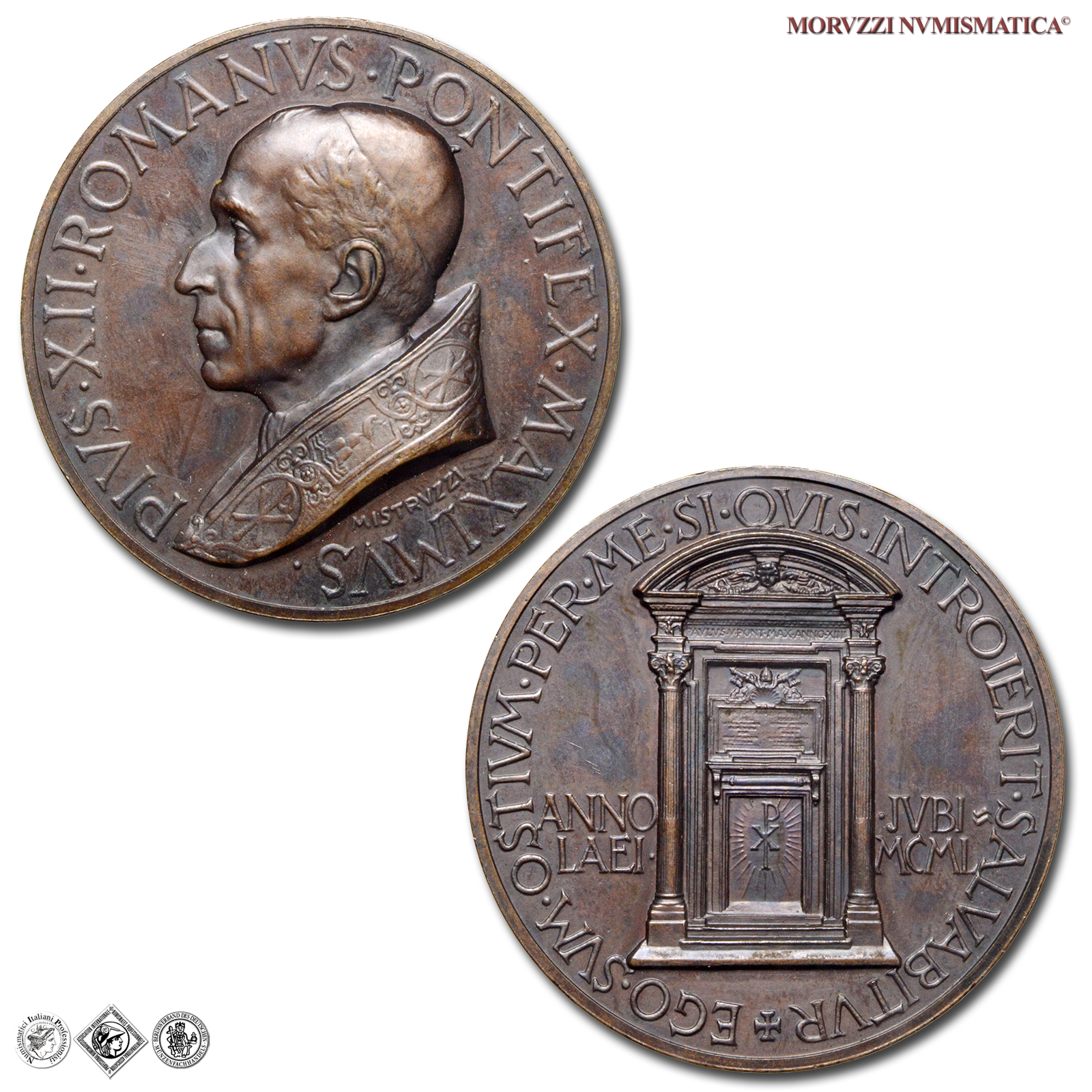 Città del Vaticano, PIO XII, Pacelli, 1939-1958, MEDAGLIA, Giubileo 1950 - La Porta Santa, Emissione: 1949, D/ PIVS • XII • ROMANVS • PONTIFEX • MAXIMVS •, busto a s. con zucchetto e piviale; sotto: MISTRVZZI, R/ EGO • SVM • OSTIVM • PER • ME • SI • QVIS • INTROIERIT • SALVABITVR ✠, la Porta Santa con al centro il monogramma raggiante di Cristo; ai lati: ANNO _ • JVBI • / LAEI • _ MCML; in basso: PAGANI, Zecca di Roma, Opus Aurelio Mistruzzi, Rif. bibl. CM, 77; Metallo: AE, gr. 36,22, (MP140970), Diam.: mm. 43,95, FDC