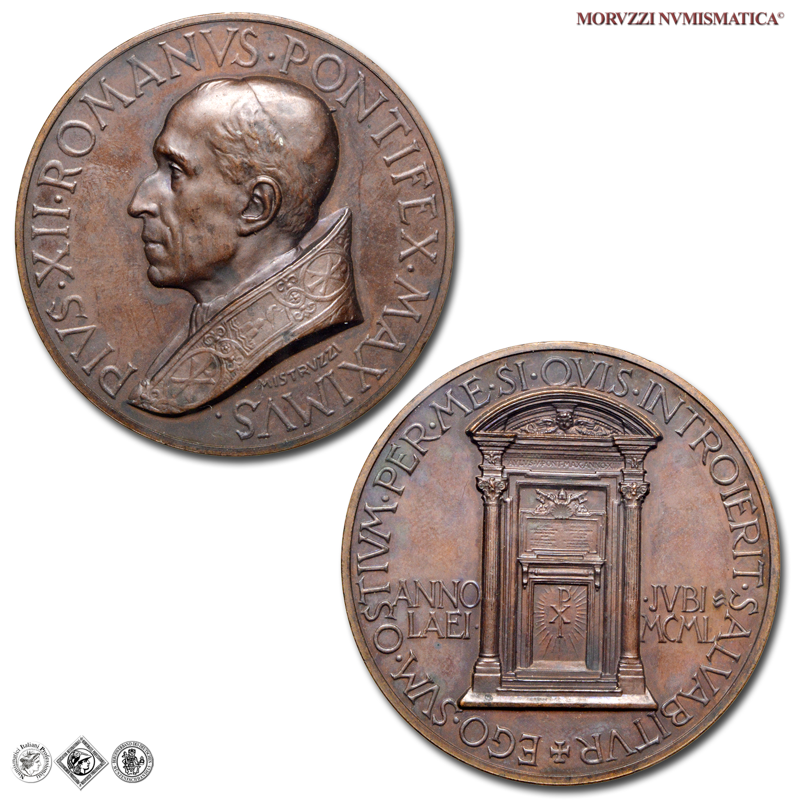 Città del Vaticano, PIO XII, Pacelli, 1939-1958, MEDAGLIA STRAORDINARIA IN BRONZO, Giubileo 1950 - La Porta Santa, Emissione: 1949, D/ PIVS • XII • ROMANVS • PONTIFEX • MAXIMVS •, busto a s. con zucchetto e piviale; sotto: MISTRVZZI, R/ EGO • SVM • OSTIVM • PER • ME • SI • QVIS • INTROIERIT • SALVABITVR ✠, la Porta Santa con al centro il monogramma raggiante di Cristo; ai lati: ANNO _ • JVBI • / LAEI • _ MCML; in basso: PAGANI, Zecca di Roma, Opus Aurelio Mistruzzi, Rif. bibl. CM, 77; Metallo: AE, gr. 35,83, (MP140953), Diam.: mm. 43,95, FDC, (NC)