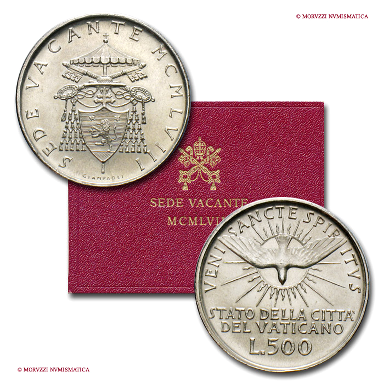 Città del Vaticano, SEDE VACANTE, 1958, LIRE 500, Emissione: 1958 (senza accento) in astuccio originale, Zecca di Roma, Rif. bibl. Unif., SV58.279; Metallo: AR, gr. 11,00, (MX147401), Diam.: mm. 29,00, FDC