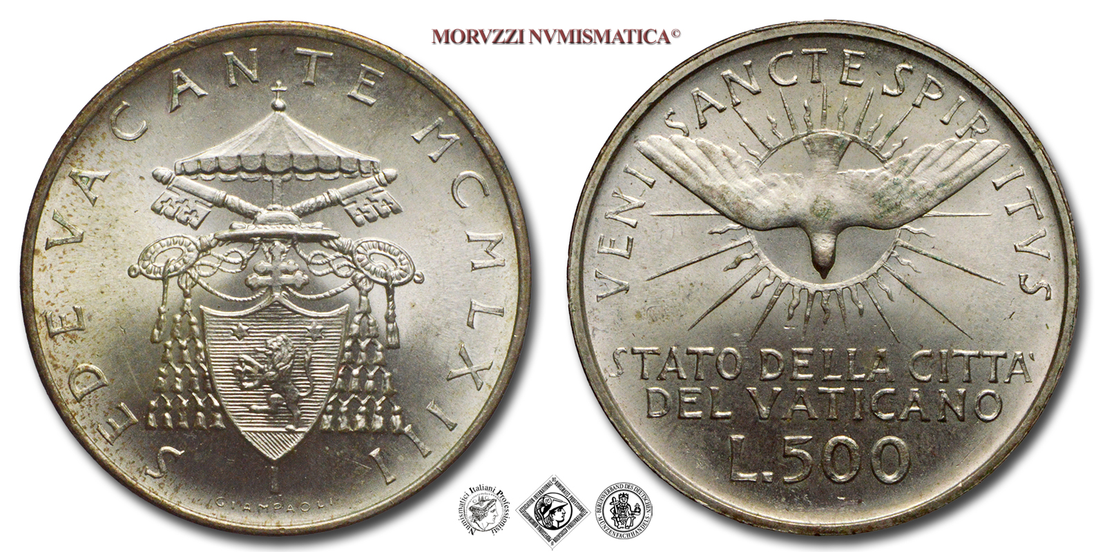 Città del Vaticano, SEDE VACANTE, 1958, LIRE 500, Con accento, Emissione: 1958, D/ SEDE VACANTE MCMLVIII, Stemma del Camerlengo Aloisi Masella, R/ VENI SANCTE SPIRITUS, Colomba radiante in volo. Al di sotto STATO DELLA CITTA' DEL VATICANO e nominale (L.500), Zecca di Roma, Rif. bibl. Pagani, 843; Metallo: AR, gr. 11,00, (MX156540), Diam.: mm. 29,36, FDC
