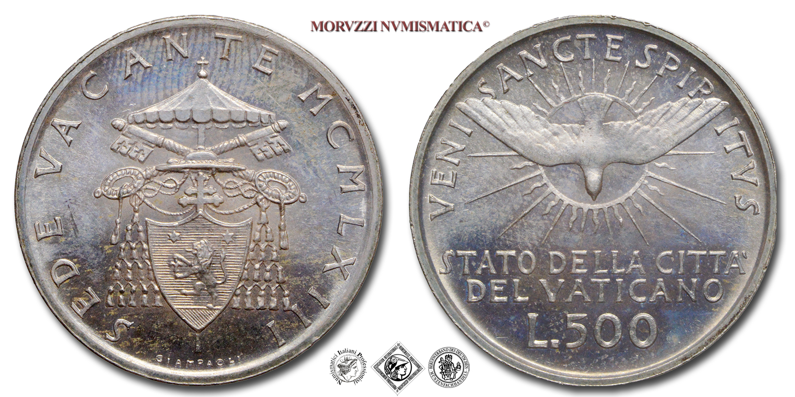 Città del Vaticano, SEDE VACANTE, LIRE 500, Card. Aloisi Masella, Emissione: 1963, D/ SEDE VACANTE MCMLVIII, stemma del Camerlengo Aloisi Masella, R/ VENI SANCTE SPIRITUS, Colomba radiante in volo. Al di sotto: STATO DELLA CITTA' DEL VATICANO e nominale (L.500), Zecca di Roma, Rif. bibl. Pagani, 980; Metallo: AR, gr. 10,96, (MX159831), Diam.: mm. 29,44, FDC