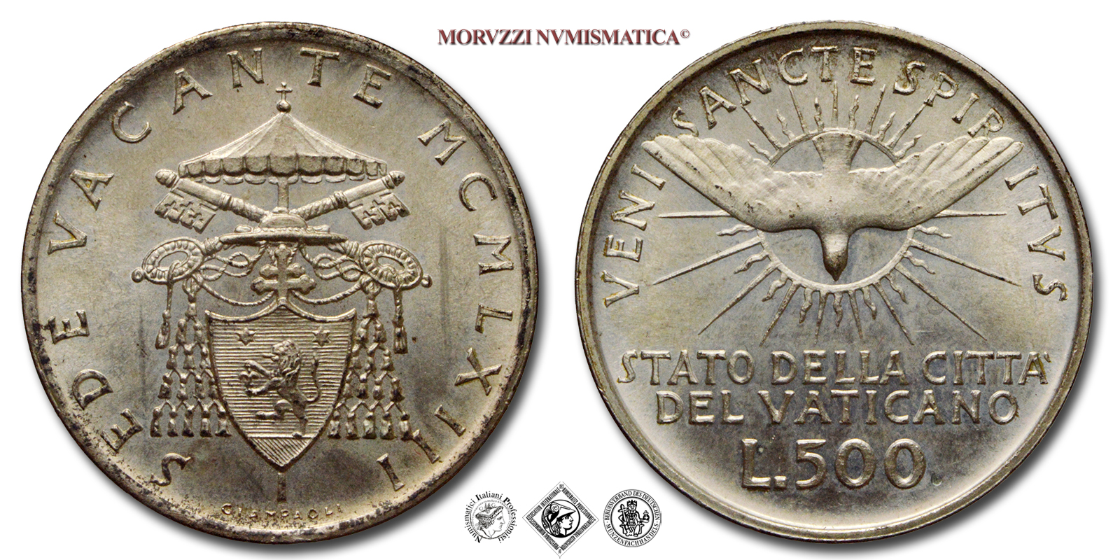 Città del Vaticano, SEDE VACANTE, LIRE 500, Card. Aloisi Masella, Emissione: 1963, D/ SEDE VACANTE MCMLVIII, stemma del Camerlengo Aloisi Masella, R/ VENI SANCTE SPIRITUS, Colomba radiante in volo. Al di sotto: STATO DELLA CITTA' DEL VATICANO e nominale (L.500), Zecca di Roma, Rif. bibl. Pagani, 980; Metallo: AR, gr. 11,00, (MX125501), Diam.: mm. 29,35, FDC