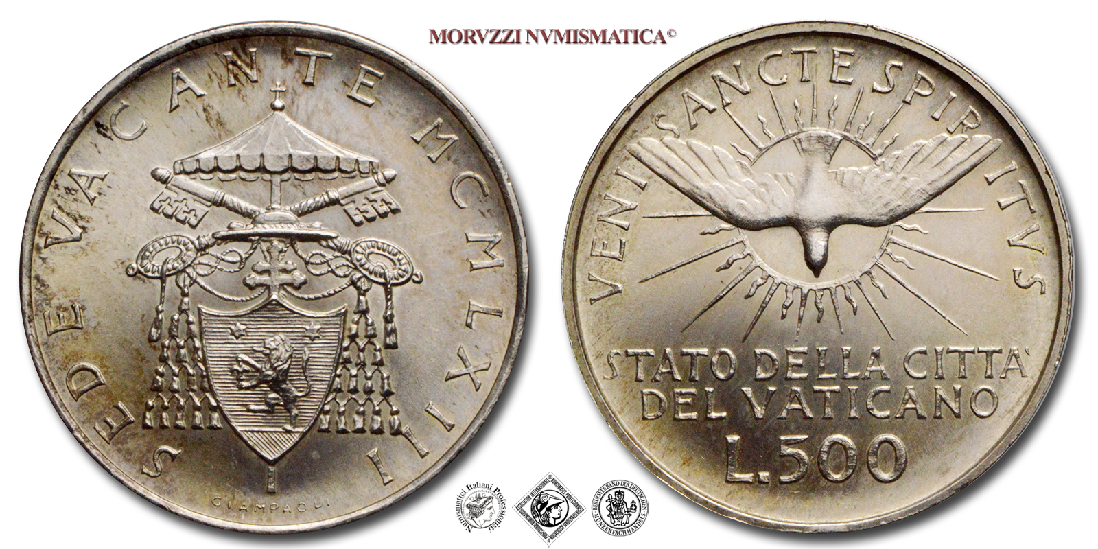 Città del Vaticano, SEDE VACANTE, LIRE 500, Card. Aloisi Masella, Emissione: 1963, D/ SEDE VACANTE MCMLVIII, stemma del Camerlengo Aloisi Masella, R/ VENI SANCTE SPIRITUS, Colomba radiante in volo. Al di sotto: STATO DELLA CITTA' DEL VATICANO e nominale (L.500), Zecca di Roma, Rif. bibl. Pagani, 980; Metallo: AR, gr. 11,00, (MX149541), Diam.: mm. 29,44, FDC