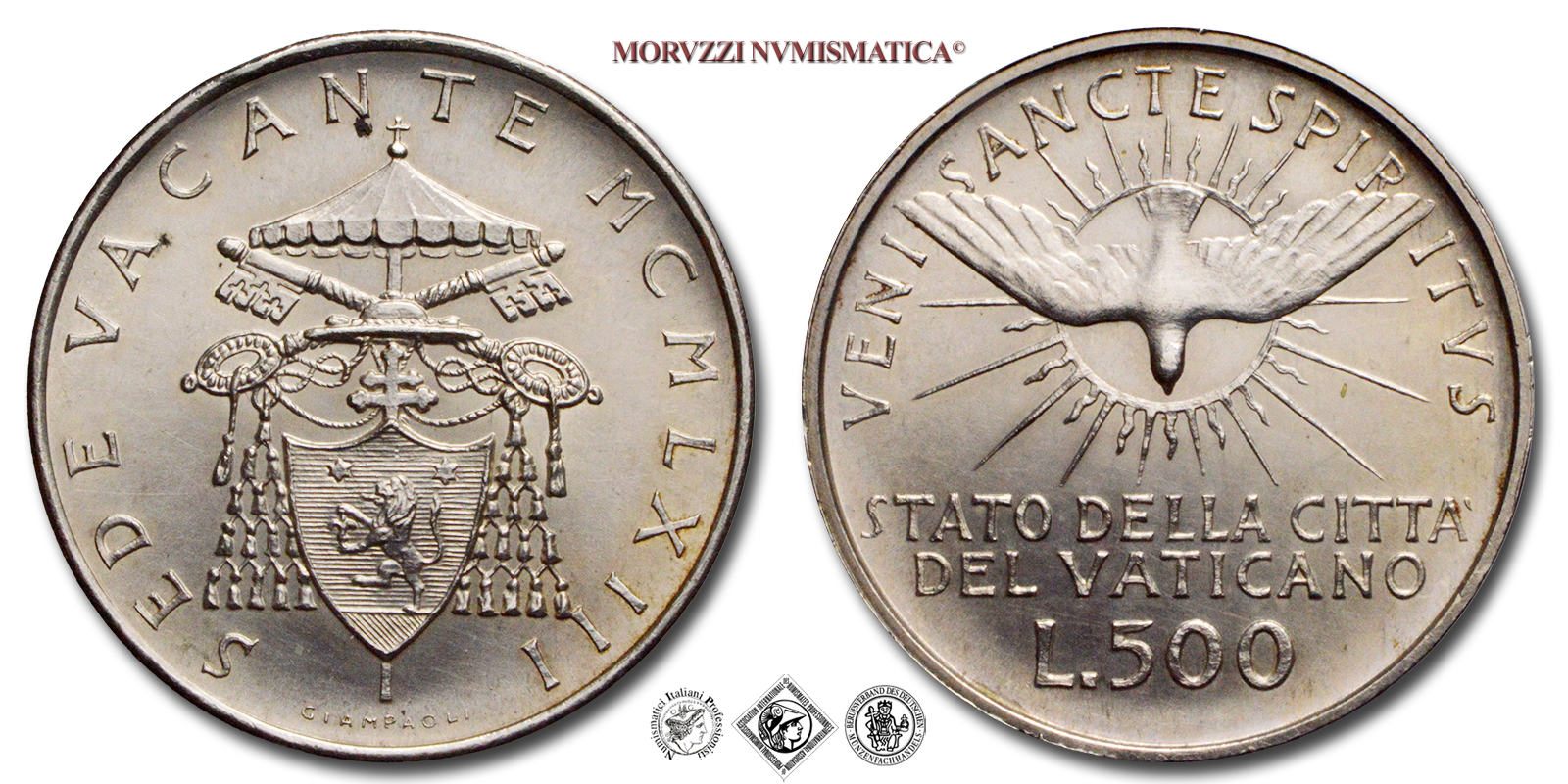 Città del Vaticano, SEDE VACANTE, LIRE 500, Card. Aloisi Masella, Emissione: 1963, D/ SEDE VACANTE MCMLVIII, stemma del Camerlengo Aloisi Masella, R/ VENI SANCTE SPIRITUS, Colomba radiante in volo. Al di sotto: STATO DELLA CITTA' DEL VATICANO e nominale (L.500), Zecca di Roma, Rif. bibl. Pagani, 980; Metallo: AR, gr. 11,00, (MX149540), Diam.: mm. 29,34, FDC
