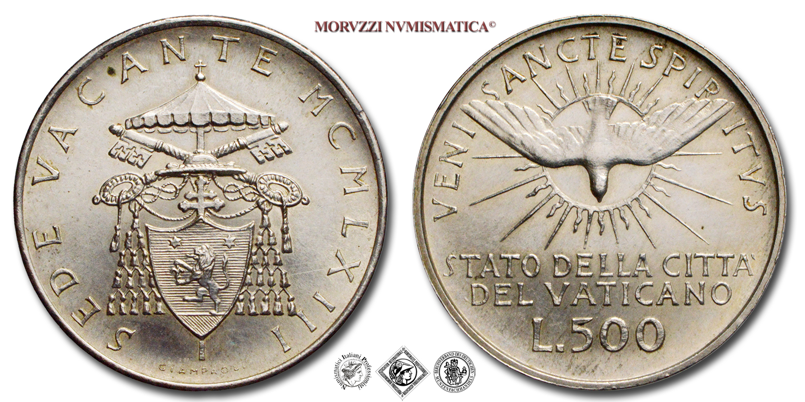 Città del Vaticano, SEDE VACANTE, LIRE 500, Card. Aloisi Masella, Emissione: 1963, D/ SEDE VACANTE MCMLVIII, stemma del Camerlengo Aloisi Masella, R/ VENI SANCTE SPIRITUS, Colomba radiante in volo. Al di sotto: STATO DELLA CITTA' DEL VATICANO e nominale (L.500), Zecca di Roma, Rif. bibl. Pagani, 980; Metallo: AR, gr. 11,00, (MX149542), Diam.: mm. 29,36, qFDC