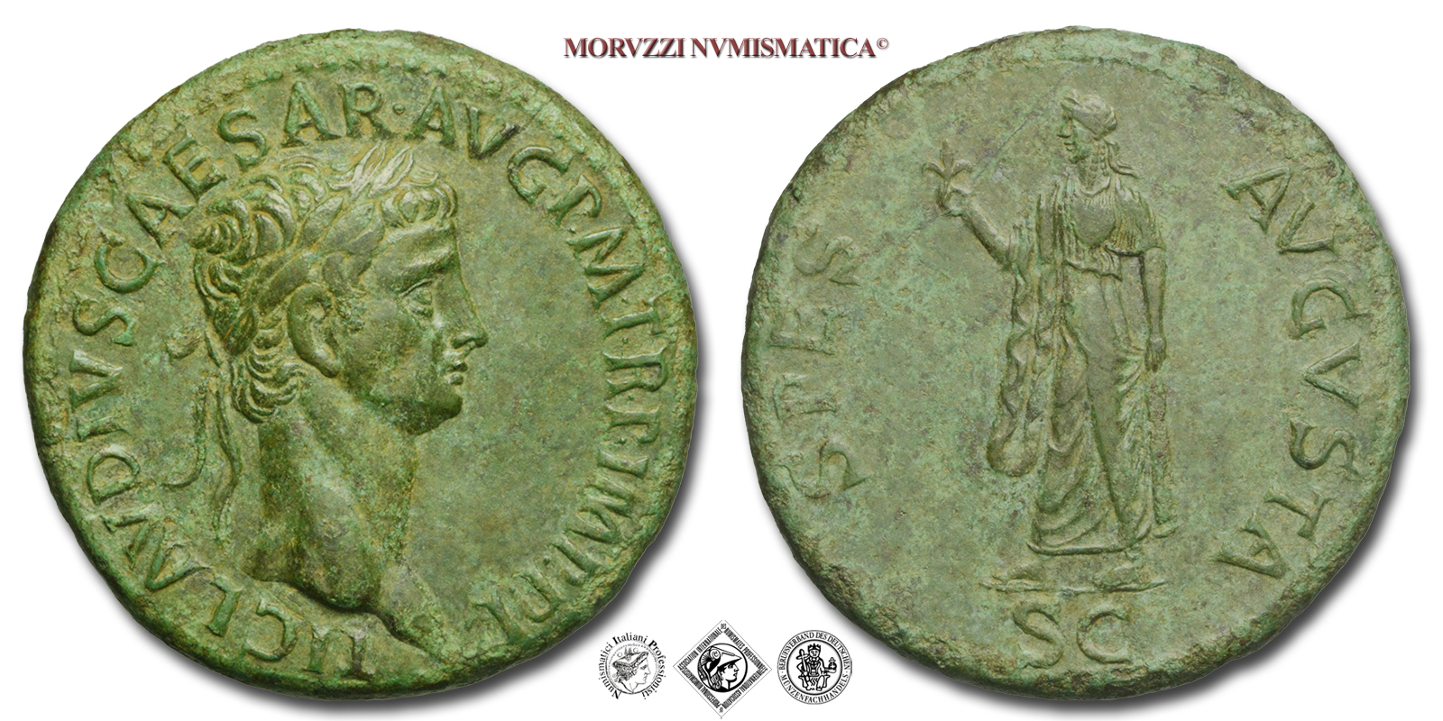 Impero Romano, CLAUDIO, 41-54 d.C., SESTERZIO, Emissione: 41-50 d.C., D/ TI CLAVDIVS CAESAR AVG P M TR P IMP P P, testa laureata a destra, R/ SPES AVGVSTA, S C, la Spes andante a sinistra con fiore nella destra solleva con la sinistra la veste, Zecca di Roma, Rif. bibl. R.I.C., 99; Cohen, 85/Fr.4; Cayon, 6; Metallo: AE, gr. 24,17, (MR160766), Diam.: mm. 36,08, SPL