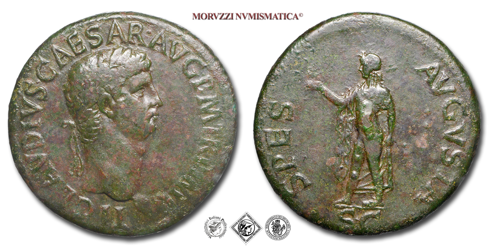 Impero Romano, CLAUDIO, 41-54 d.C., SESTERZIO, Emissione: 50-54 d.C., D/ TI CLAVDIVS CAESAR AVG P M TR P IMP, testa laureata a destra, R/ SPES AVGVSTA S C, la Spes stante a sinistra con un fiore nella destra solleva il lembo della veste con la sinistra, Zecca di Roma, Rif. bibl. R.I.C., 115; Cohen, 85/Fr.4; Cayon, 6/550; Metallo: AE, gr. 28,09, (MR158551), Diam.: mm. 35,52, BB