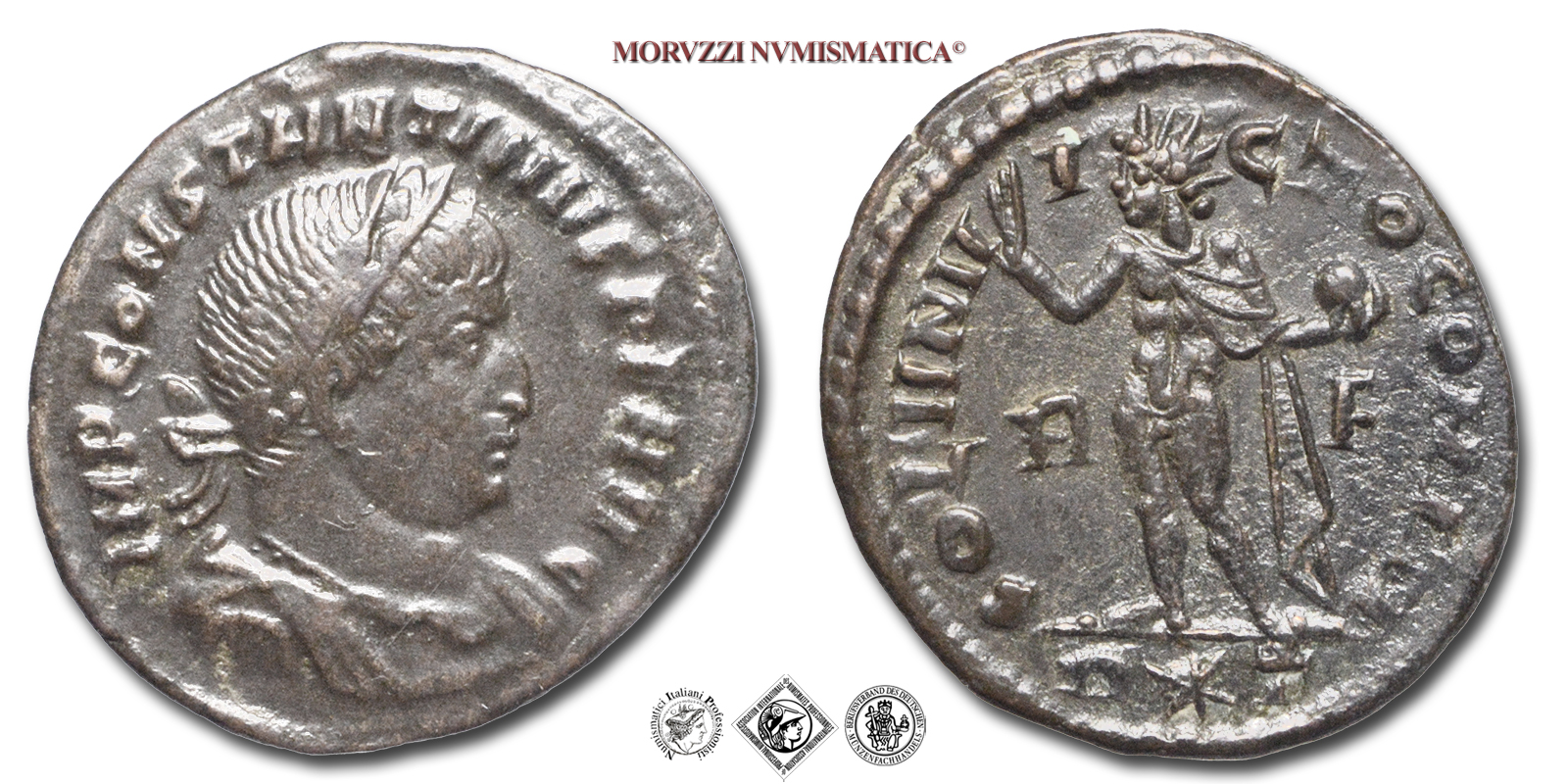 Impero Romano, COSTANTINO I, 307-337 d.C., FOLLIS, Emissione: 314 d.C., D/ IMP CONSTANTINVS P F AVG, busto laureato, drappeggiato e corazzato a destra, R/ SOLI INVICTO COMITI / R F / R * T, il Sole radiato stante a sinistra, solleva la destra e tiene un globo nella sinistra, Zecca di Roma, Rif. bibl. R.I.C., 19; Cohen, 536; Metallo: AE, gr. 3,03, (MR27163), Diam.: mm. 20,49, mBB, (NC)