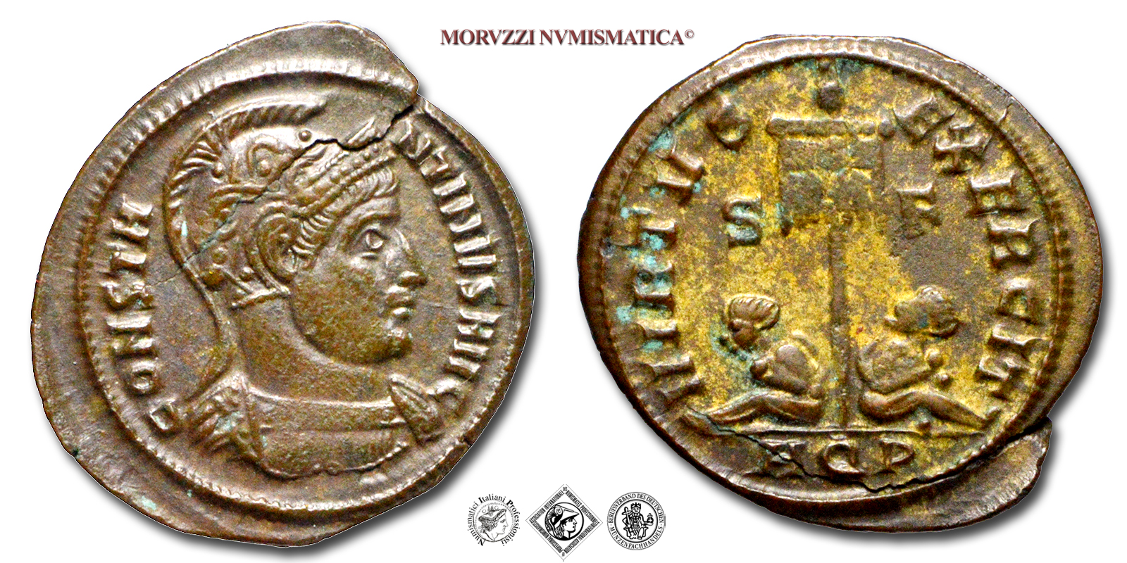 Impero Romano, COSTANTINO I, 307-337 d.C., AE 3, Emissione: 320 d.C., D/ CONSTANTINVS AVG, busto con elmo e corazza a d., R/ VIRTVS EXERCIT, VOT XX, S-F, AQP, stendardo ai cui piedi sono due prigionieri seduti, Zecca di Aquileia, Rif. bibl. R.I.C., 48; Cohen, 693; Metallo: AE, gr. 2,78, (MR163127), Diam.: mm. 18,98, qSPL