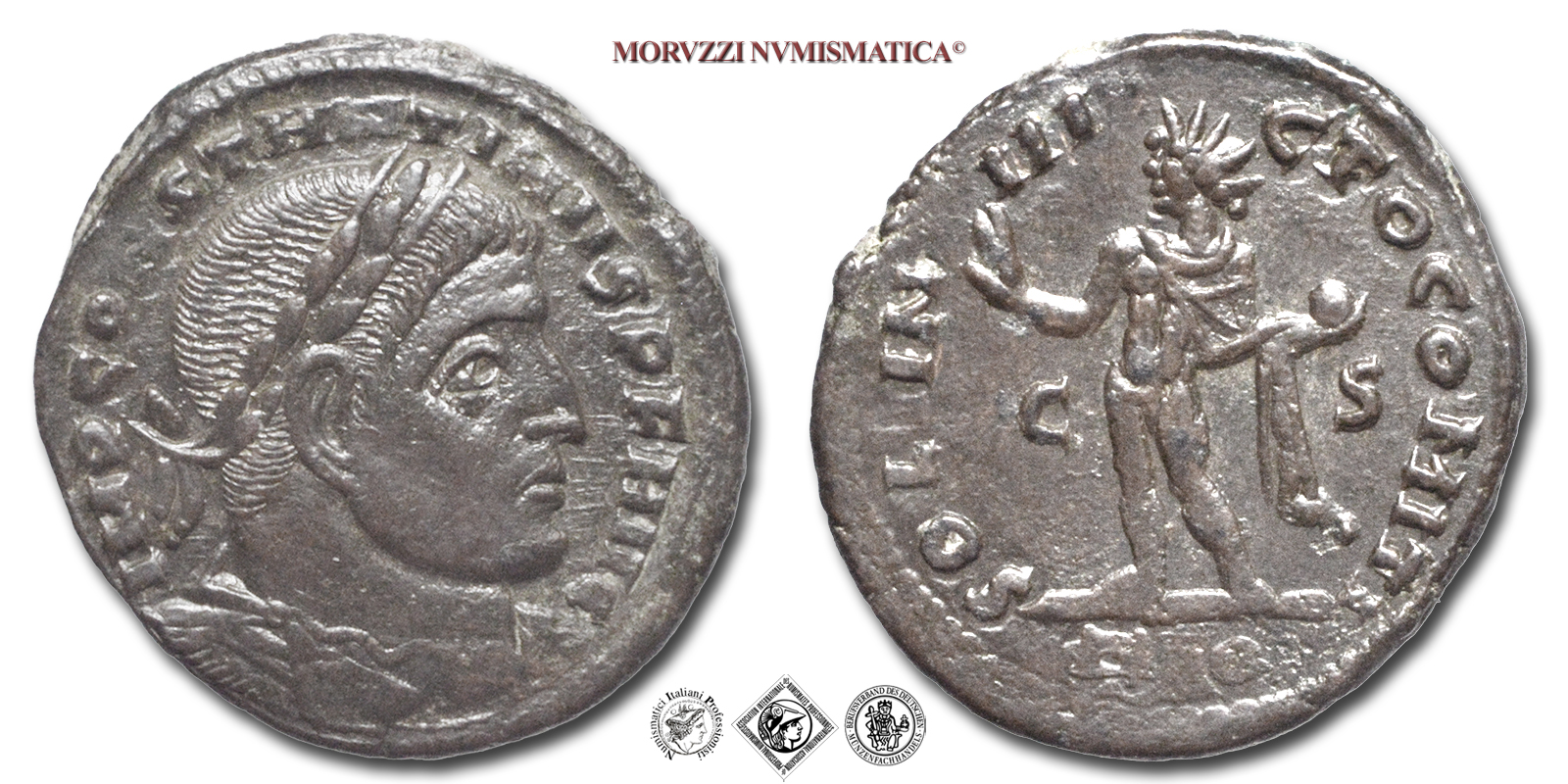 Impero Romano, COSTANTINO I, 303-337 d.C., PICCOLO BRONZO, Emissione: 317-318 d.C., D/ IMP CONSTANTINVS P F AVG, busto laureato e corazzato a d., R/ SOLI INVICTO COMITI, C S, ….., il Sole stante a s., la testa volta a d., tiene un globo nella s. e leva la mano destra; nel campo a s. una stella, Zecca illeggibile, Rif. bibl. R.I.C., ----; Cohen, 536; Metallo: AE, gr. 3,70, (MR27178), Diam.: mm. 19,49, qSPL