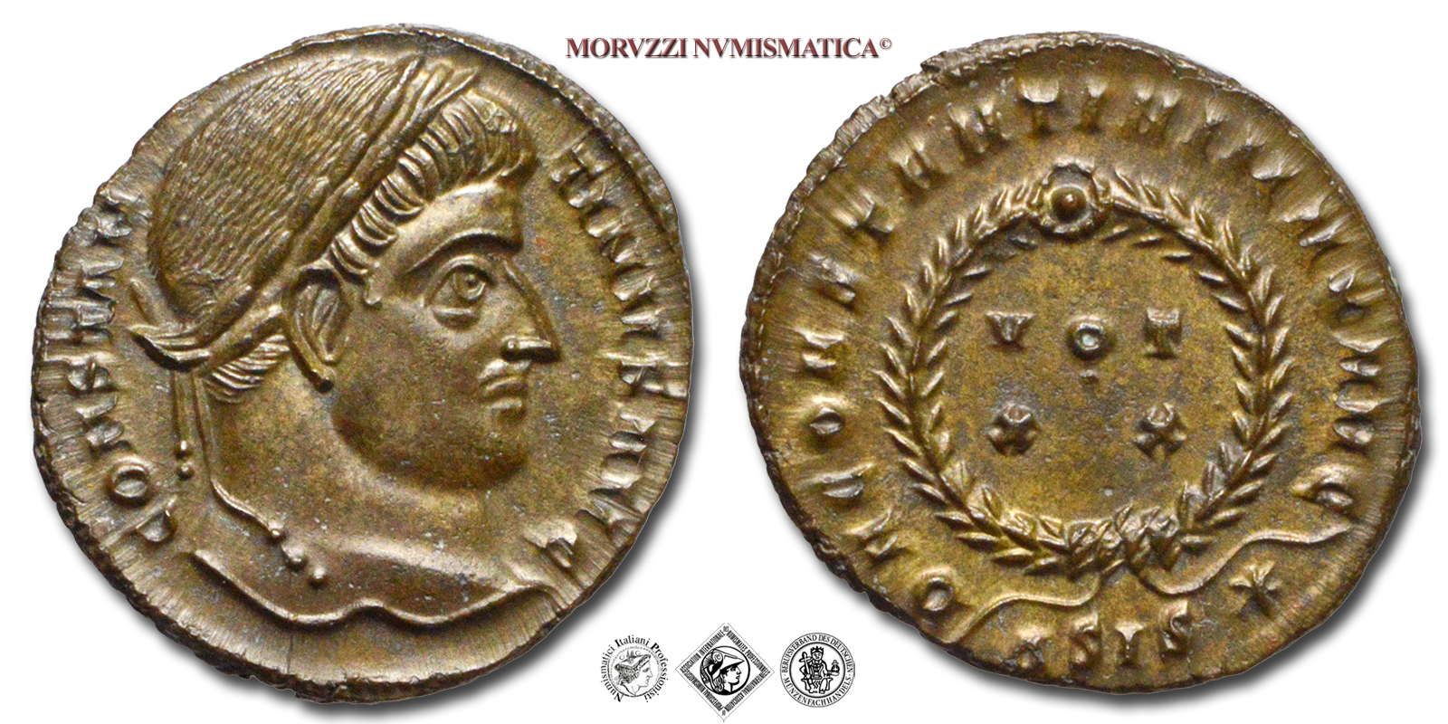 Impero Romano, COSTANTINO I, 303-337 d.C., PICCOLO BRONZO, Emissione: 320-321 d.C., D/ CONSTANTINVS AVG, testa laureata a d., R/ D N CONSTANTINI MAX AVG, VOT XX, ESIS*, in corona laurea, Zecca di Siscia, Rif. bibl. R.I.C., 159; Cohen, 123; Metallo: AE, gr. 3,05, (MR163134), Diam.: mm. 18,65, qFDC