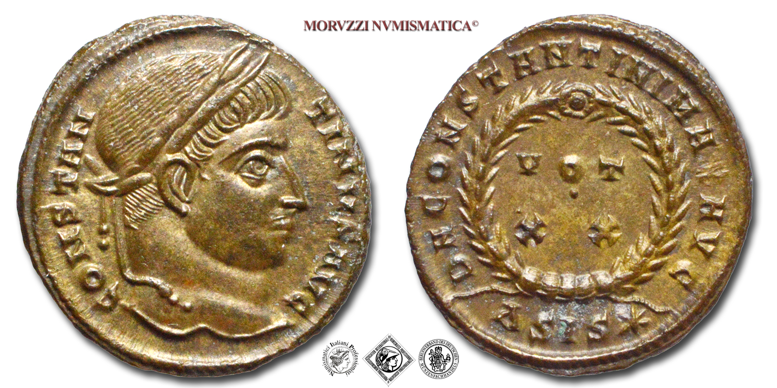 Impero Romano, COSTANTINO I, 303-337 d.C., PICCOLO BRONZO, Emissione: 320-321 d.C., D/ CONSTANTINVS AVG, testa laureata a d., R/ D N CONSTANTINI MAX AVG, VOT XX, #D#SIS*, in corona laurea, Zecca di Siscia, Rif. bibl. R.I.C., 159; Cohen, 123; Metallo: AE, gr. 3,18, (MR163138), Diam.: mm. 19,30, mSPL