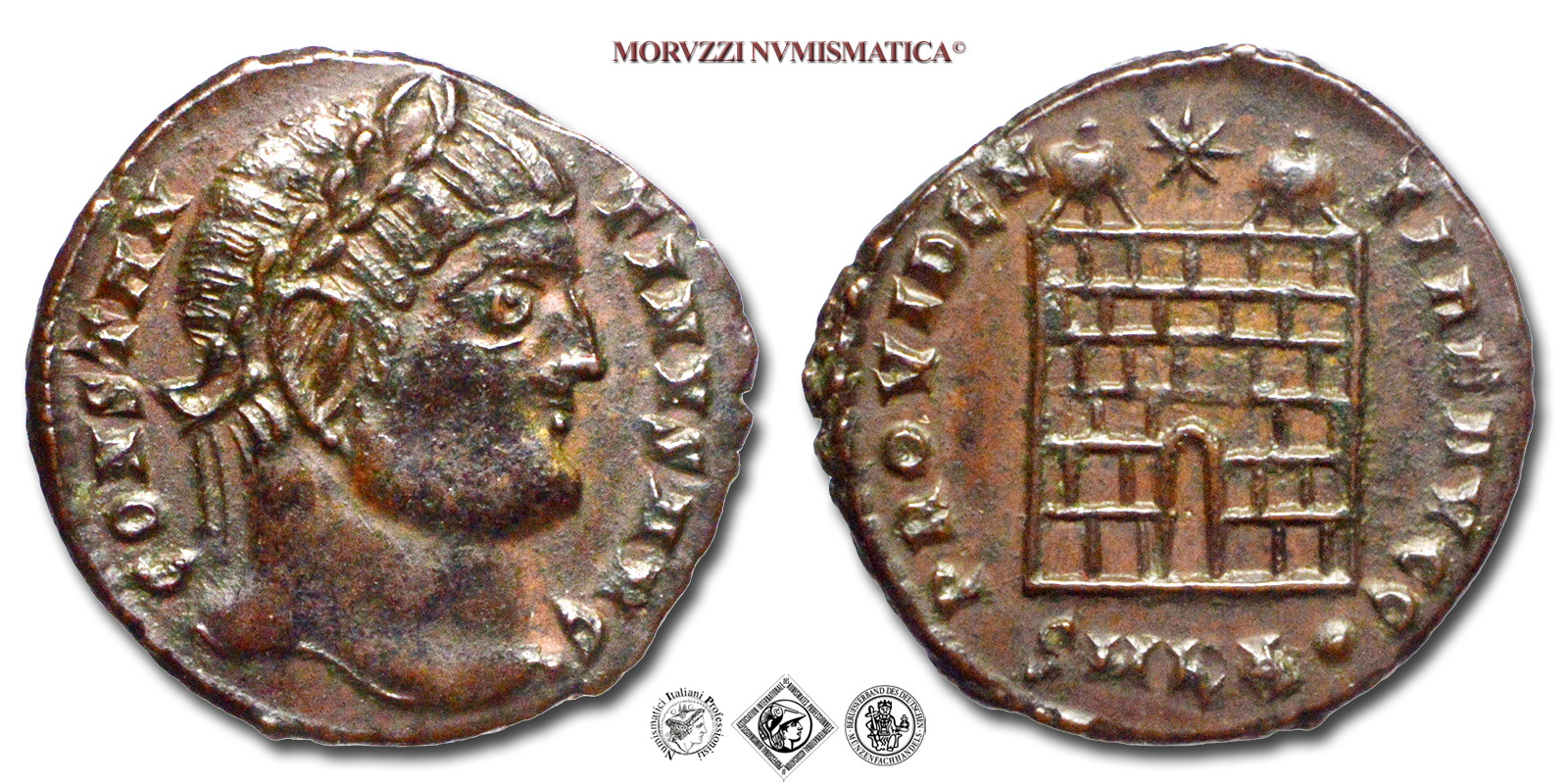 Impero Romano, COSTANTINO I, 307-337 d.C., PICCOLO BRONZO, Emissione: 325-326 d.C., D/ CONSTANTINVS AVG, testa laureata a d., R/ PROVIDENTIAE AVGG, SMKA •, porta del campo aperta sormontata da due torri; in alto una stella, Zecca di Cizico, Rif. bibl. R.I.C., 34; Cohen, 454; Metallo: AE, gr. 3,17, (MR160348), Diam.: mm. 18,49, qSPL