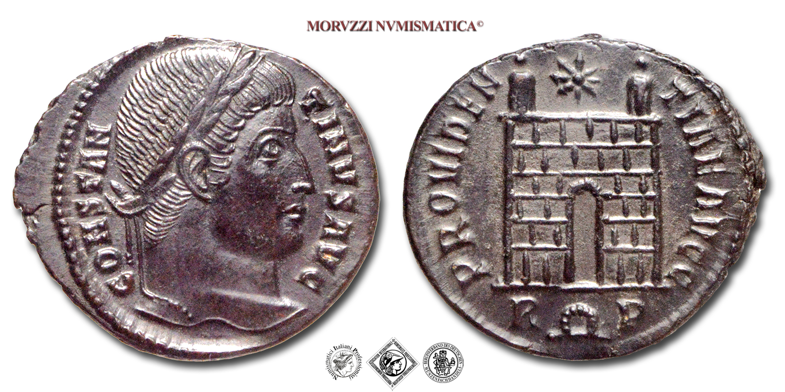 Impero Romano, COSTANTINO I, 307-337 d.C., PICCOLO BRONZO, Emissione: 326 d.C., D/ CONSTANTINVS AVG, testa diademata a destra, R/ PROVIDENTIAE AVGG, R corona P, porta del campo sormontata da una stella, Zecca di Roma, Rif. bibl. R.I.C., 287; Cohen, 454; Metallo: AE, gr. 2,83, (MR163125), Diam.: mm. 20,07, SPL