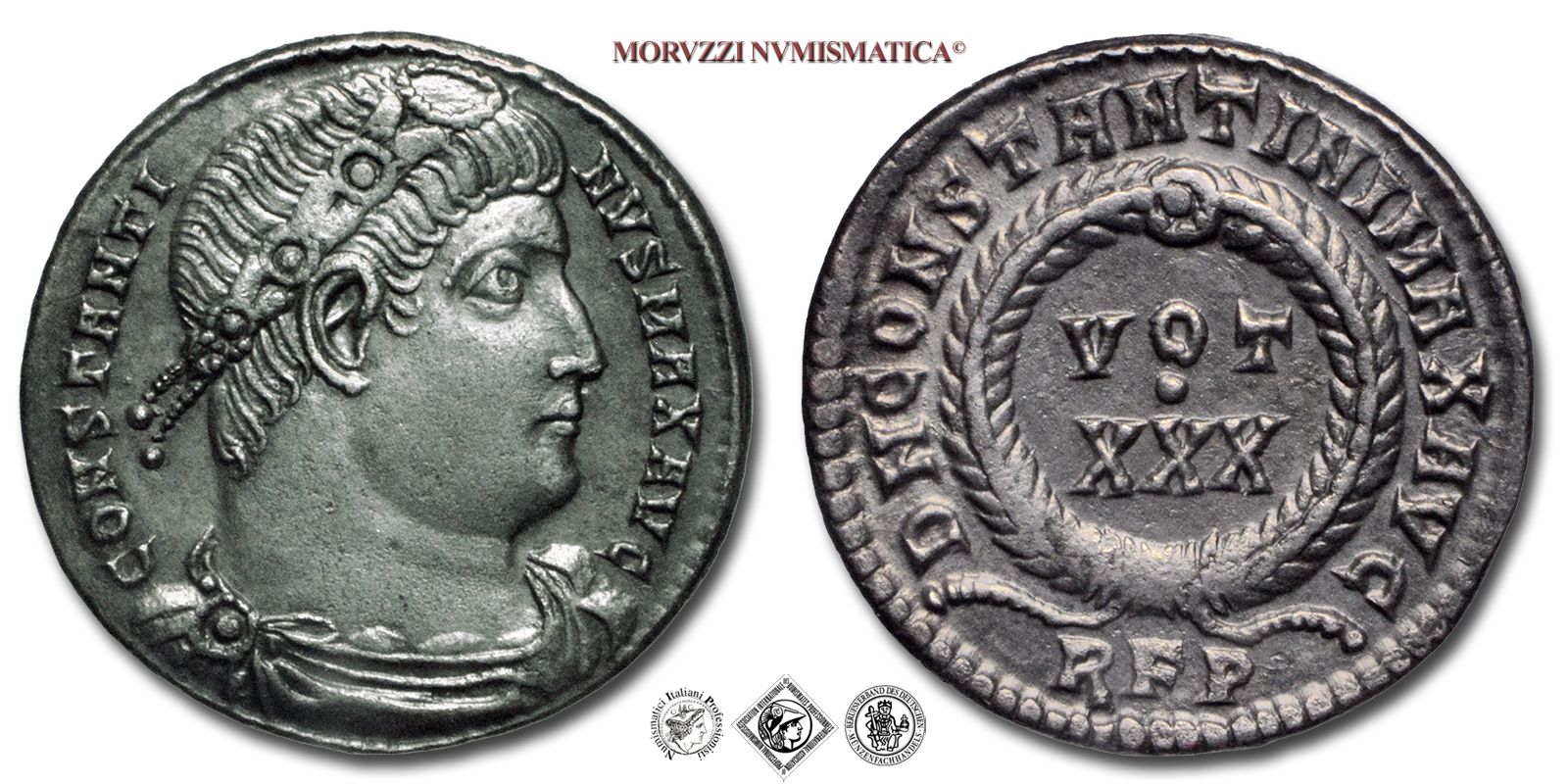 Impero Romano, COSTANTINO I, 307-337 d.C., PICCOLO BRONZO, Emissione: 329-330 d.C., D/ CONSTANTINVS MAX AVG, testa laureata a destra, R/ D N CONSTANTINI MAX AVG, VOT XXX, RFP, in corona laurea, Zecca di Roma, Rif. bibl. R.I.C., 322/R; Cohen, 129; Metallo: AE, gr. 3,24, (MR160328), Diam.: mm. 17,02, SPL, (R)