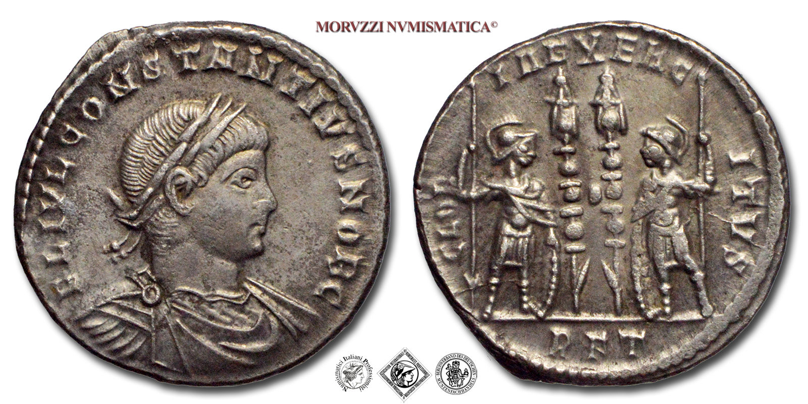 Impero Romano, COSTANZO II, Cesare, 337-361 d.C., PICCOLO BRONZO, Emissione: 330 d.C., D/ FL IVL CONSTANTIVS NOB C, busto laureato, drappeggiato e corazzato a destra, R/ GLORIA EXERCITVS / R F T, due soldati stanti l'uno di fronte all'altro tengono lancia e scudo. Tra i due, due insegne, Zecca di Roma, Rif. bibl. R.I.C., 329; Cohen, 104; Metallo: AE, gr. 2,77, (MR160384), Diam.: mm. 18,05, mBB