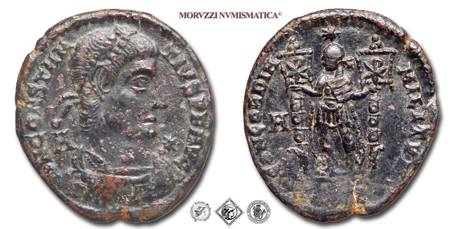 Impero Romano, COSTANZO II, 337-361 d.C., PICCOLO BRONZO, Emissione: 350 d.C., D/ D N CONSTANTIVS P F AVG, busto laureato con paludamento e corazza a destra. Dietro A, R/ CONCORDIA MILITVM, BSIS tra due globetti, l'imperatore stante a sinistra con due insegne con cristogramma. A sinistra A. Sopra la testa una stella, Zecca di Siscia, Rif. bibl. R.I.C., 273/R; Cohen, 3/Fr.2; Metallo: AE, gr. 4,32, (MR25022), Diam.: mm. 23,58, mBB, (R)
