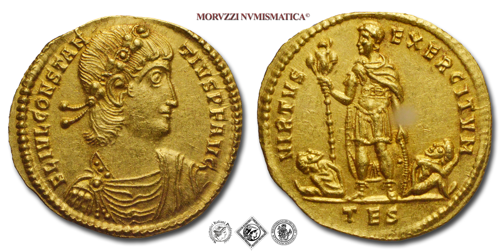 Impero Romano, COSTANZO II, 337-361 d.C., SOLIDO, Emissione: 337-340 d.C., D/ FL IVL CONSTANTIVS P F AVG, busto diademato con paludamento e corazza a destra, R/ VIRTVS EXERCITVM, TES, l'imperatore stante a sinistra in abiti militari con scettro aquilifero nella destra; ai suoi piedi da entrambi i lati due prigionieri seduti, Zecca di Tessalonica, Rif. bibl. R.I.C., 32; Cohen, manca; Metallo: AU, gr. 4,55, (MR162673), Diam.: mm. 22,56, SPL, (R)