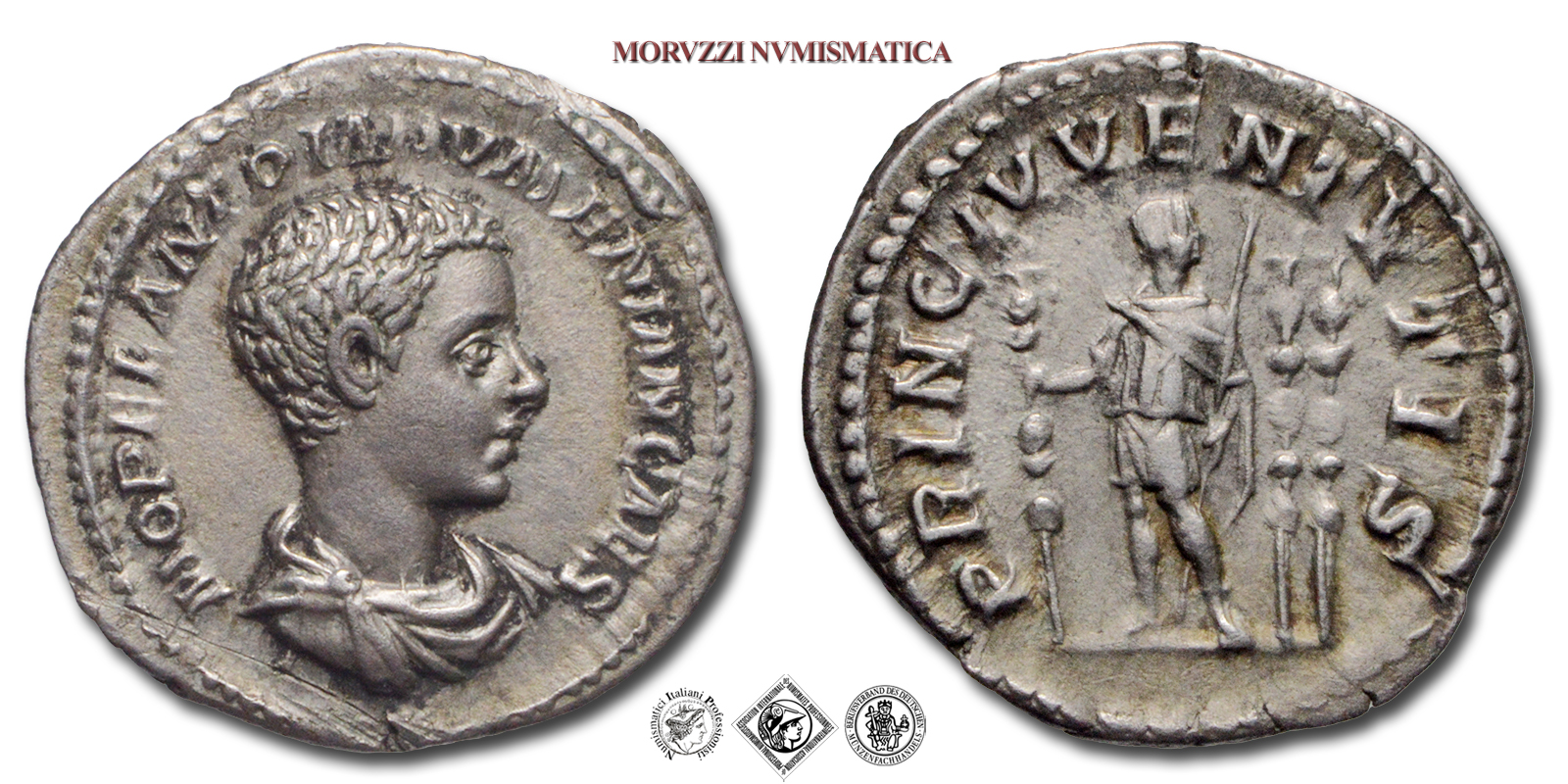 Impero Romano, DIADUMENIANO, Cesare, 217-218 d.C., DENARIO, Emissione: 217-218 d.C., D/ M OPEL ANT DIADVMENIAN CAES, busto a testa nuda con paludamento a destra, R/ PRINC IVVENTVTIS, l'imperatore stante di fronte volto a destra tiene con la destra una insegna e con la sinistra un corto scettro. A destra due insegne, Zecca di Roma, Rif. bibl. R.I.C., 102/S; Cohen, 3/Fr.15; Metallo: AR, gr. 3,60, (MR162744), Diam.: mm. 20,56, qSPL, (R)