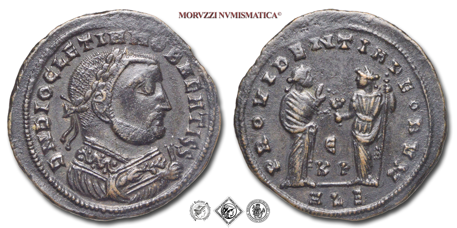 Impero Romano, DIOCLEZIANO, 284-305 d.C., FOLLIS, Emissione: 308-310 d.C., D/ DN DIOCLETIANO BEATISS, busto laureato con il mantello imperiale con ramoscello di olivo nella destra e mappa nella sinistra a destra, R/ PROVIDENTIA DEORVM, ALE, E K P, la Providentia stante a destra leva in alto la destra dinanzi alla Quiete stante a sinistra con ramoscello di olivo nella destra e scettro nella sinistra, Zecca di Antiochia, Rif. bibl. R.I.C., 109; Metallo: AE, gr. 6,43, (MR160312), Diam.: mm. 22,80, SPL, (NC)