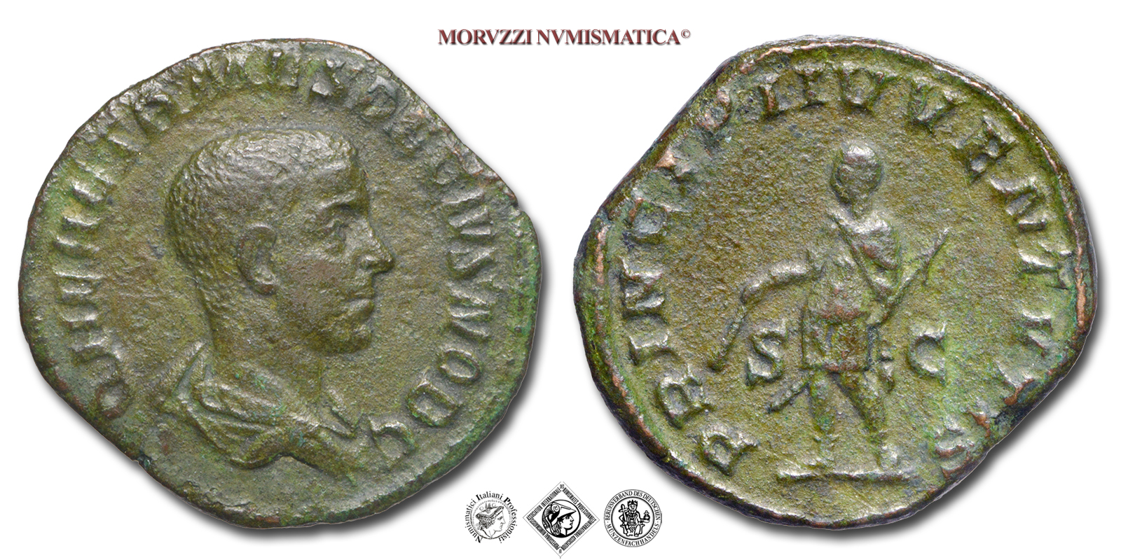 Impero Romano, ERENNIO ETRUSCO, 251 d.C., SESTERZIO, Emissione: 250-251 d.C., D/ Q HER ETR MES DECIVS NOB C, busto drappeggiato visto di spalle a destra, R/ PRINCIPI IVVENTVTIS, S C, Erennio stante di fronte in abiti militari volto a s. tiene una bacchetta nella destra e scettro nella sinistra, Zecca di Roma, Rif. bibl. R.I.C., 173/R; Cohen, 31; Metallo: AE, gr. 20,72, (MR161577), Diam.: mm. 29,79, BB, (R)