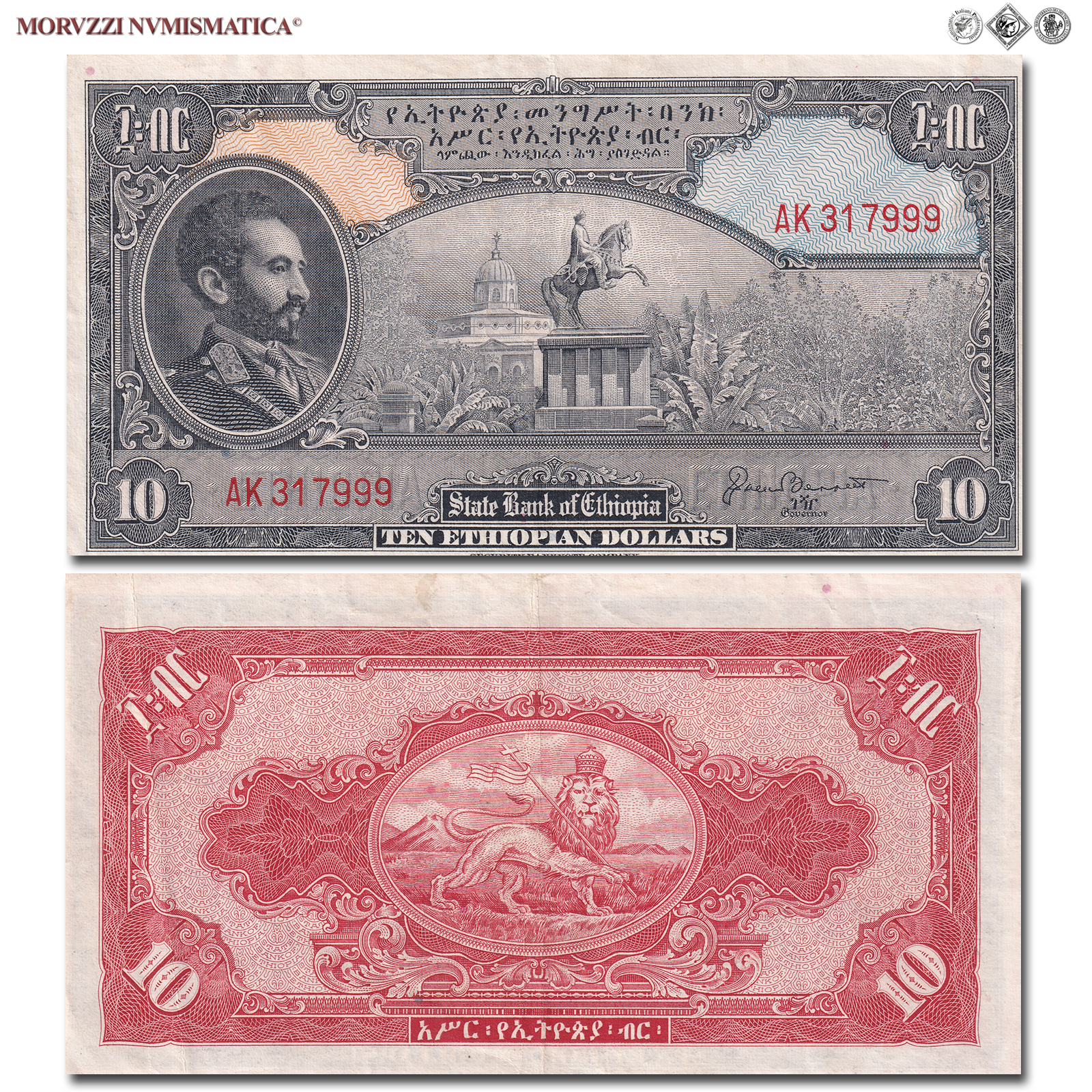 Etiopia, BANCA NAZIONALE D'ETIOPIA, BIRR 10, Hailé Selassie I, 1949-1953, D/ የኢትዮጵያ፡መንግስት፡ባንክ፡ አሥር፡የኢትዮጵያ፡ብር፡ ላምጪው፡አንዴከፈል፡ሕግ፡ያሰገዽዷል። STATE BANK OF ETHIOPIA TEN ETHIOPIAN DOLLARS, L'imperatore Haile Selassie I a sinistra, la statua equestre dell'imperatore Menelik II in piazza San Giorgio al centro, l'edificio sullo sfondo, R/ ፲፡ብር አሥር፡የኢትዮጵያ፡ብር፡, Leone di Giuda al centro, Security Banknote Company (SBNC, Philadelphia, United States), Rif. bibl. Pick, 14b; (CE160546), Firme: Jack Bennett (JB, Governatore), n° di serie: AK 317999, SPL