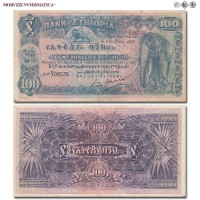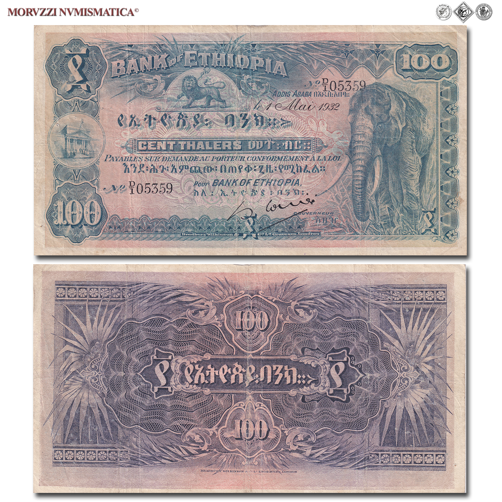 Etiopia, BANCA NAZIONALE D'ETIOPIA, THALERS 100, Hailé Selassie I, 1932-1933, D/ BANK OF ETHIOPIA ADDIS ABABA የኢትዮጵያ፡ባንክ። CENT THALERS መቶ፡ብር። PAYABLES SUR DEMAND AU PORTEUR CONFORMEMENT A LA LOI, Edificio bancario a sinistra, leone in alto al centro, elefante a destra, R/ 100 የኢትዮጵያ፡ባንክ። ፻, Bradbury Wilkinson and Company (United Kingdom), Rif. bibl. Pick, 10; (CE160545), Firme: Charles S. Collier (CSC, Governatore), n° di serie: D/I 05359, BB, (RRR)